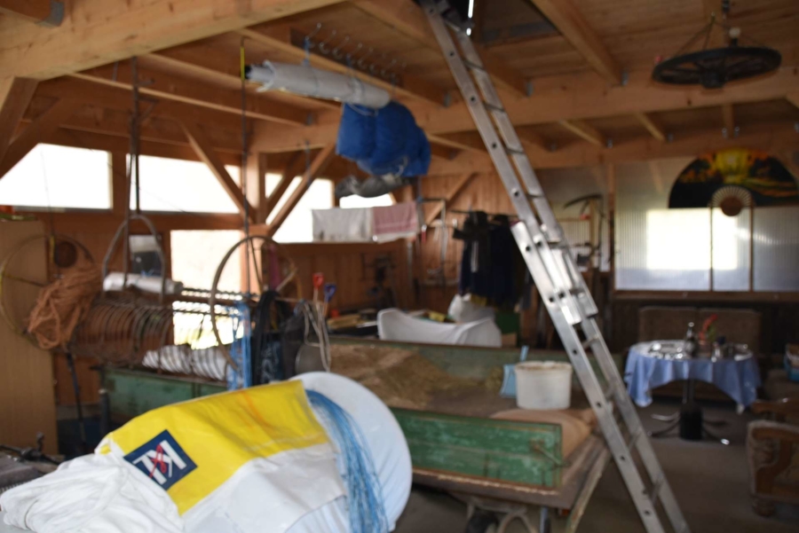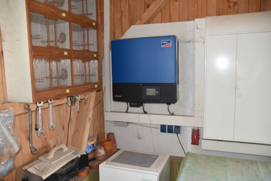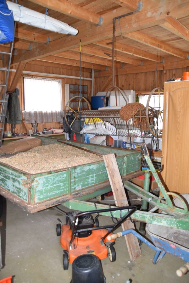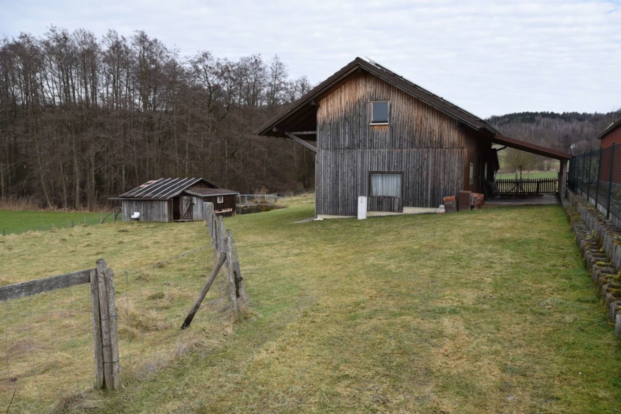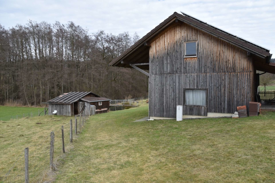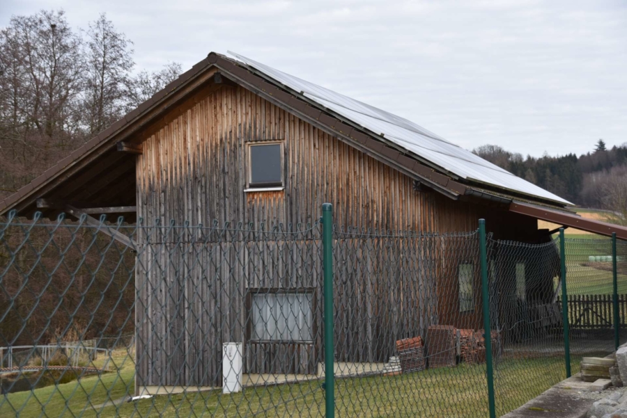Ebenfalls angrenzend ist ein zusätzliches Grundstück mit 2998 m² Fläche, auf dem eine moderne Maschinenhalle mit drei großen Toren steht und ein angrenzender Ziegenstall und Carport. Das Gebäude steht auf einer betonierten Bodenplatte und wurde in hochwertiger Holzständerbauweise errichtet. Auf dem Dach befindet sich eine PV Anlage mit 7,83 KW/h Leistung. Die monatliche Einspeisevergütung beträgt hier 218,- Euro Brutto und ist im Kaufpreis enthalten und läuft noch rund 10 Jahre.