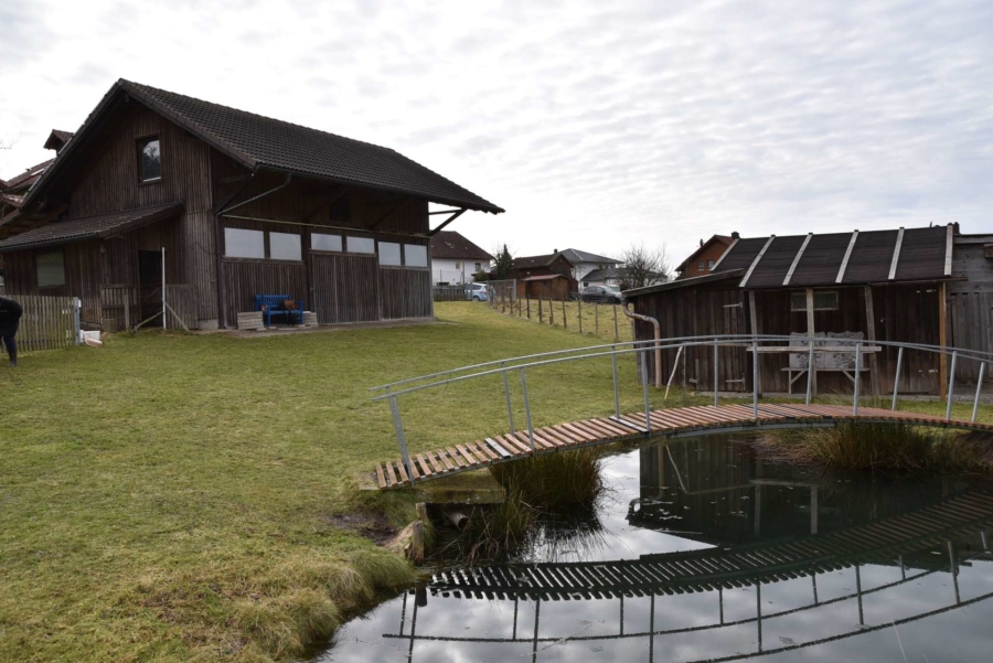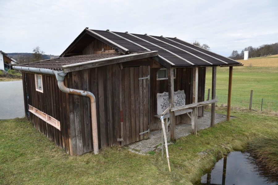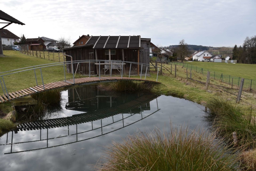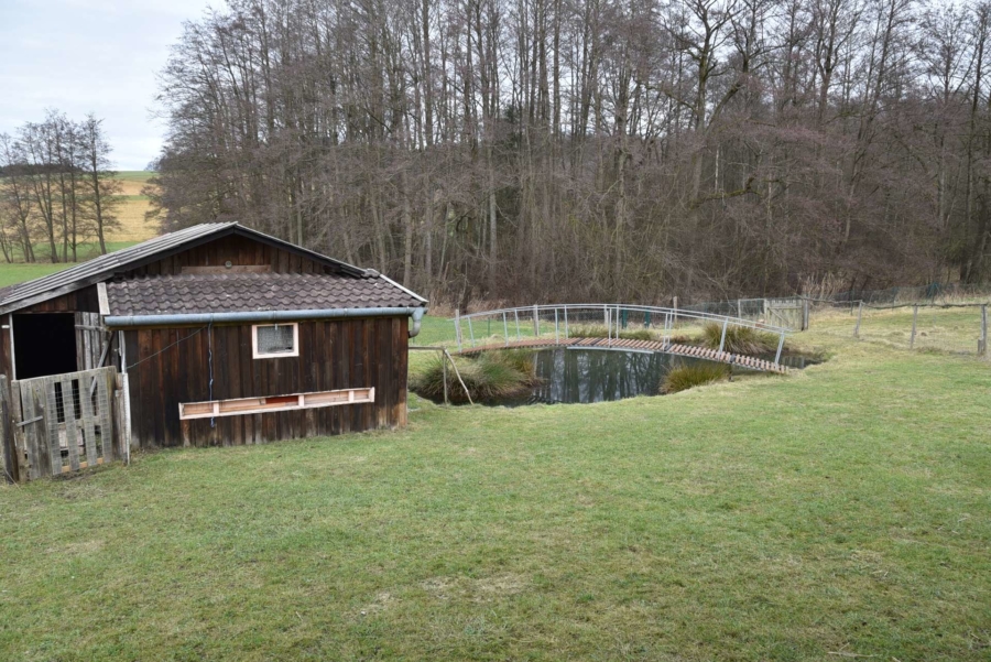 Gegenüber der Halle steht eine Gartenhütte mit kleinem Teich. Eine schöne Streuobstwiese mit zahlreichen Obstbäumen ist ebenfalls enthalten.