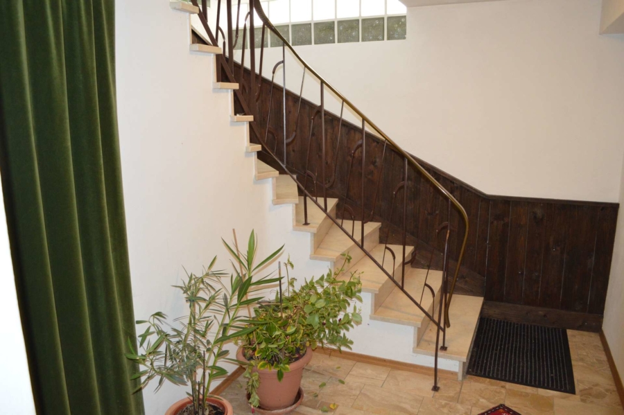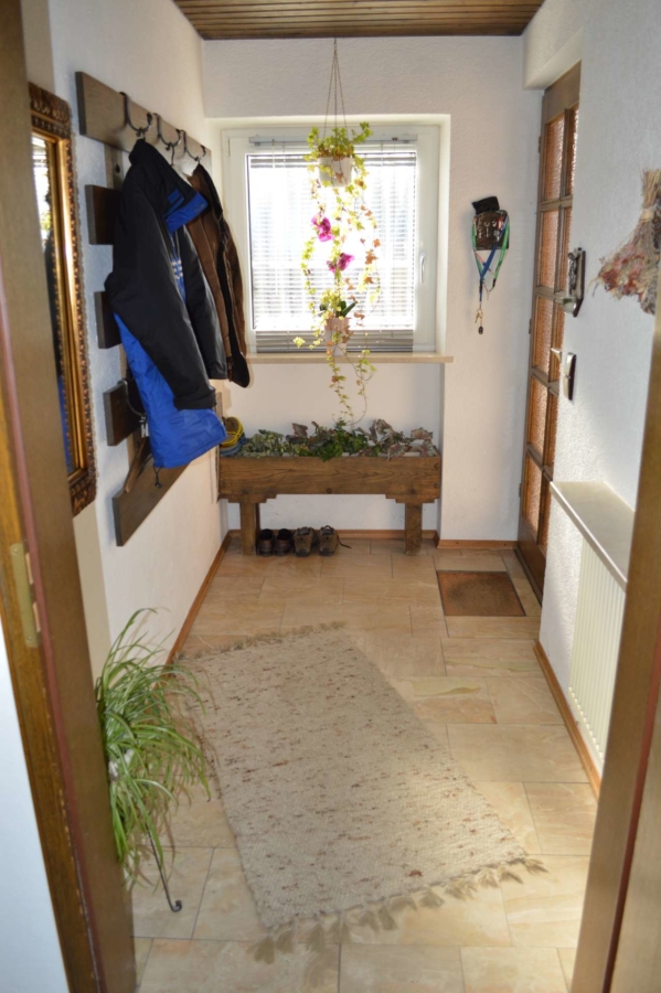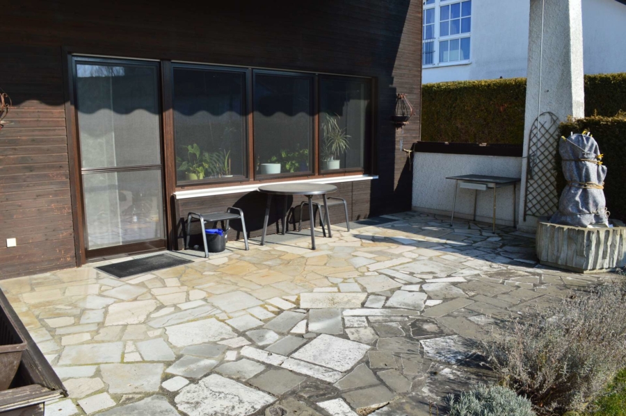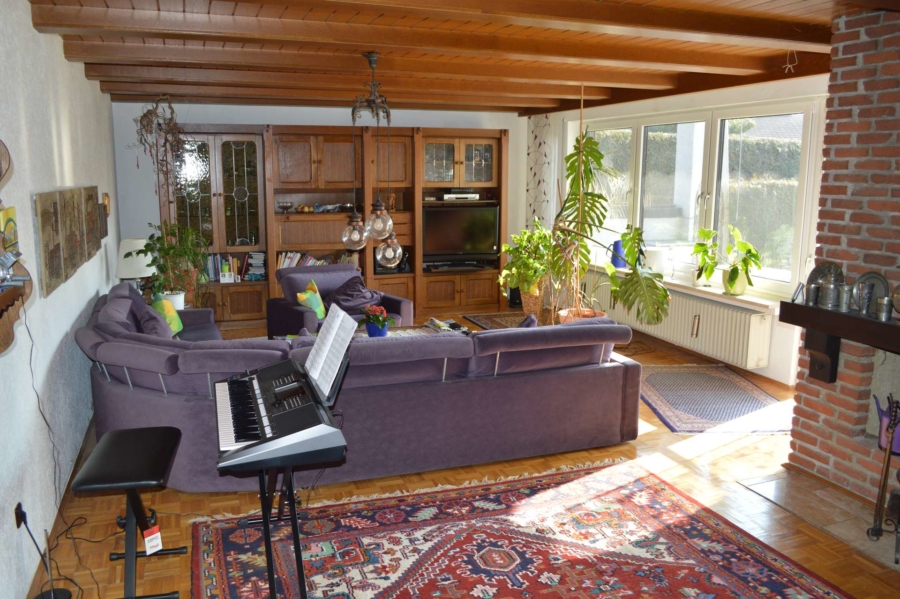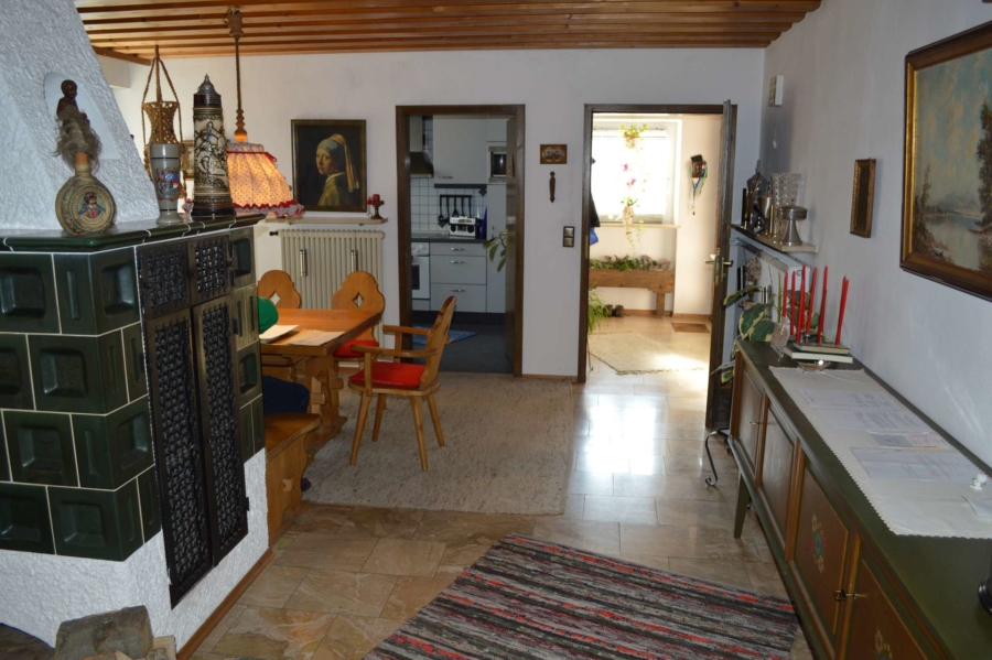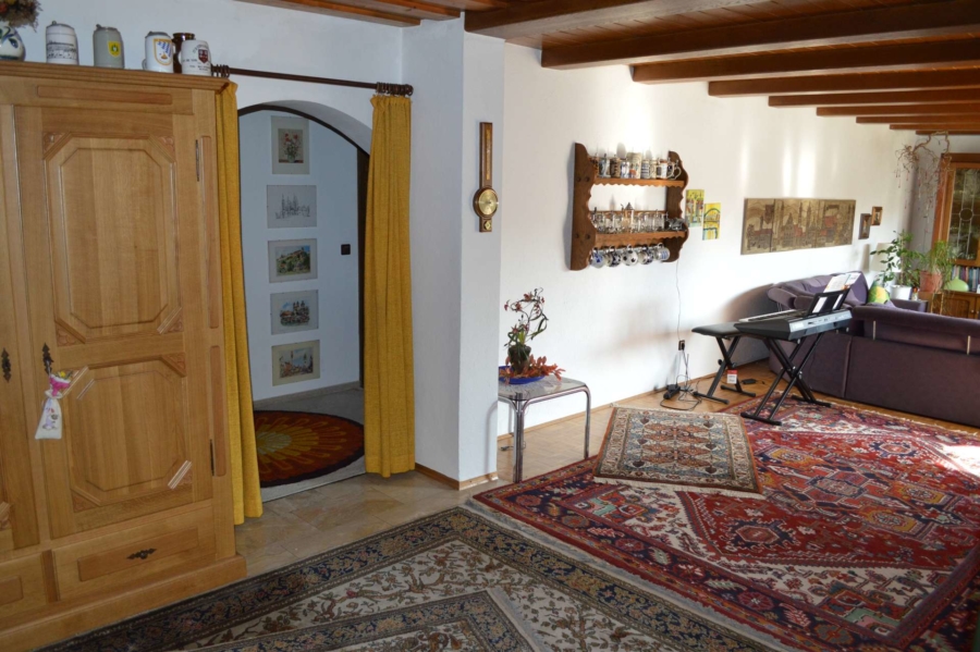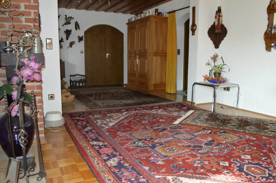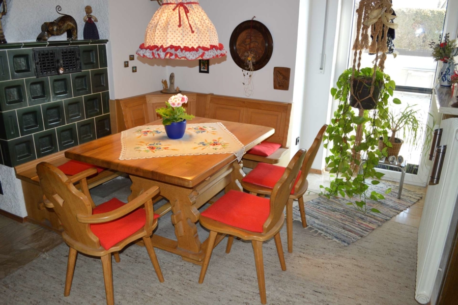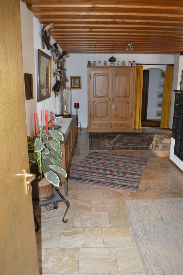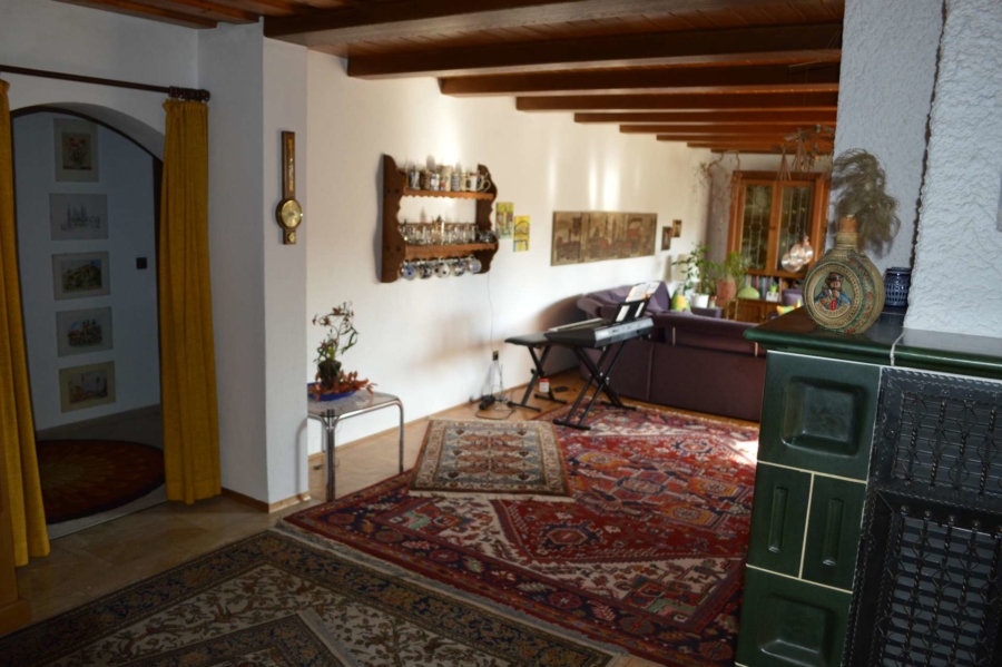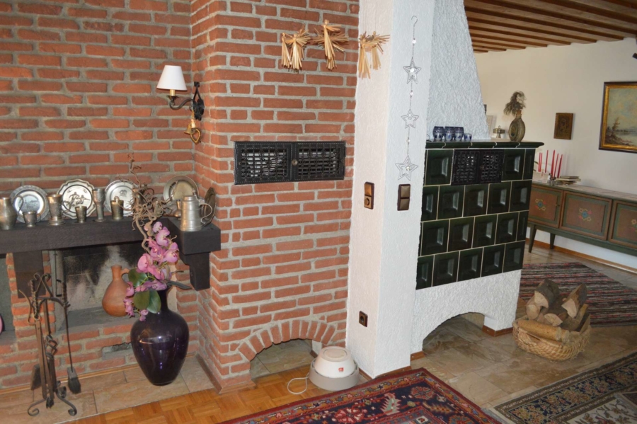 Das Haus besticht durch seinen offen gehaltenen Wohn- Essbereich. Die Küche ist direkt an das Esszimmer angrenzend. Die große Terrasse erreicht man entweder direkt vom Esszimmer aus oder vom Wohnzimmer. Der Essbereich ist mit zeitlosem, hellem Marmorboden belegt. Im Wohnzimmer findet man massiven Parkettboden. Die Räume sind sehr hell und verfügen zuätzlich über einen großen Kachelofen sowie über einen offenen Kamin.