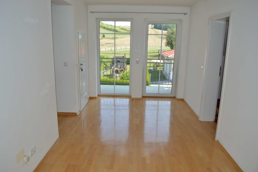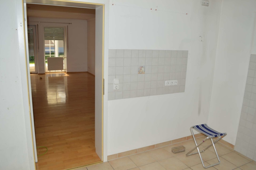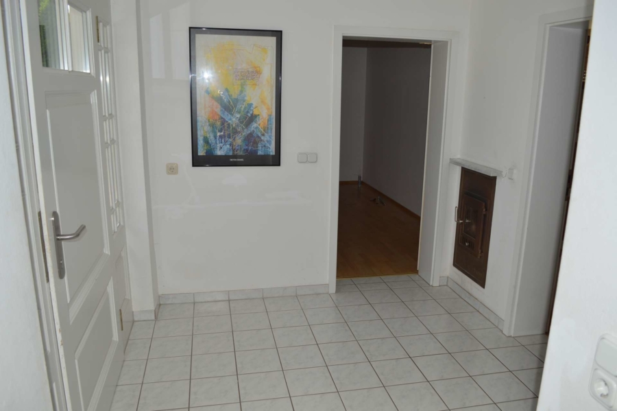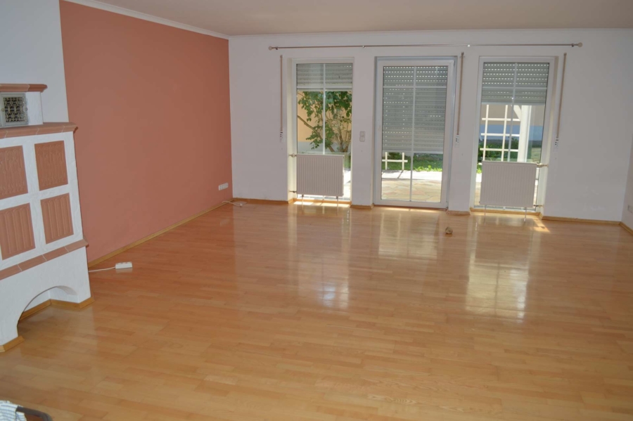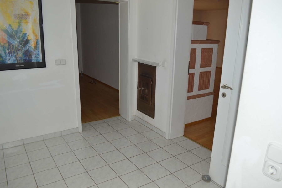 Die Böden im Wohnbereich sind mit hellem Parkett belegt. Das schöne große Wohnzimmer ist mit einem Kachelofen ausgestattet. Gleich an das helle Wohnzimmer schließt die Küche an, von der man in eine Speisekammer kommt. Ebenfalls von der Küche kommen Sie auf eine überdachte Terrasse mit Zugang zum Garten.