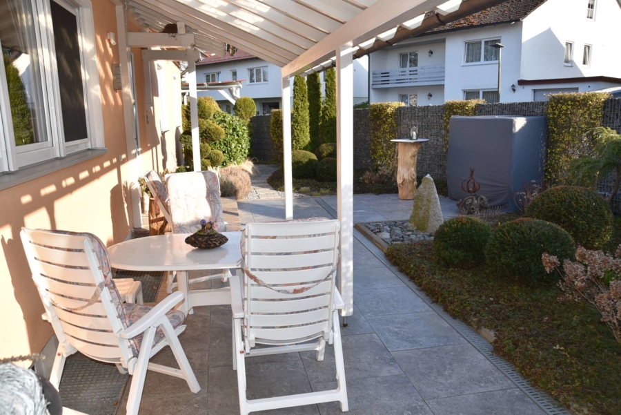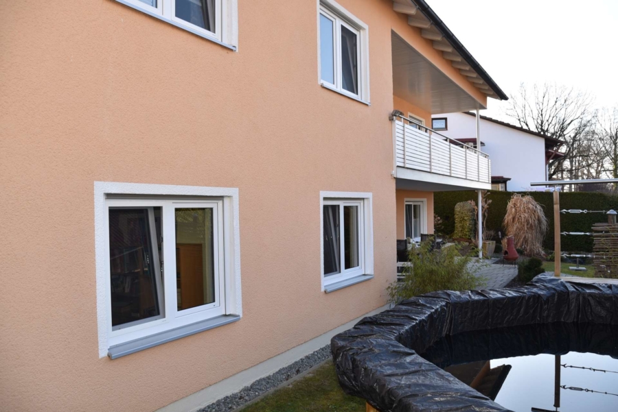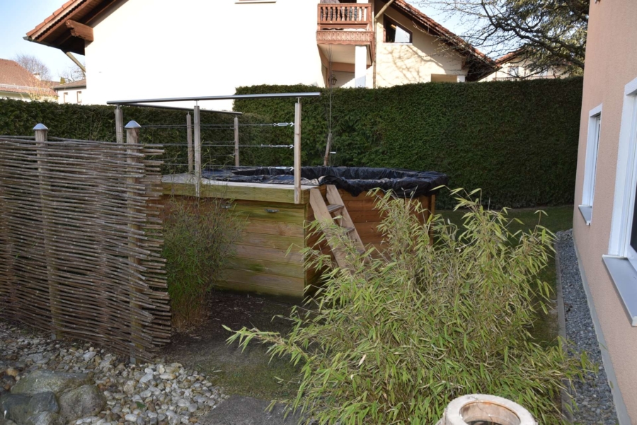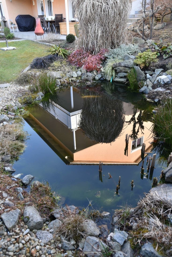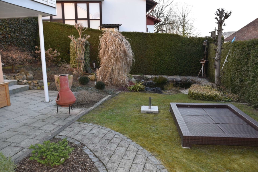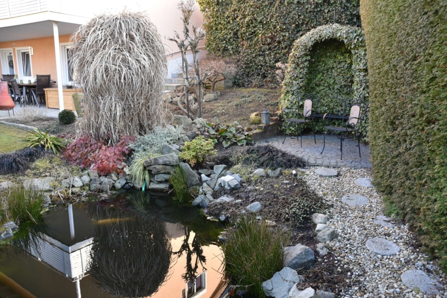 Der topgepflegte und professionell angelegte Garten lässt ebenfalls keinerlei Wünsche offen. Er bietet zahlreiche Rückzugs-/ und Sitzmöglichkeiten. Es gibt einen kleinen Gartenteich und einen tollen Außenpool zur Erfrischung und Erholung. Der Garten ist von aussen praktisch nicht einsehbar.