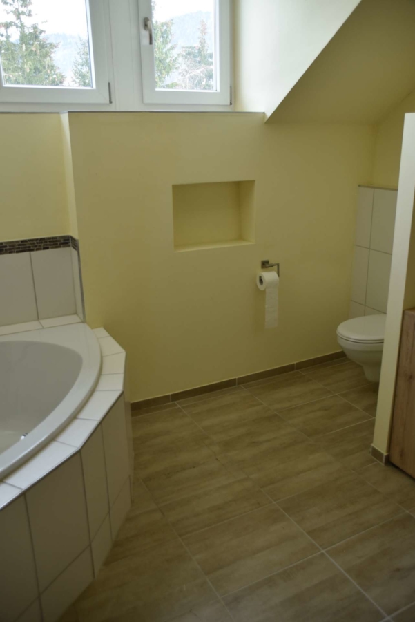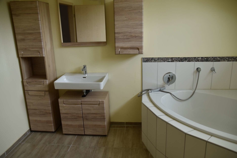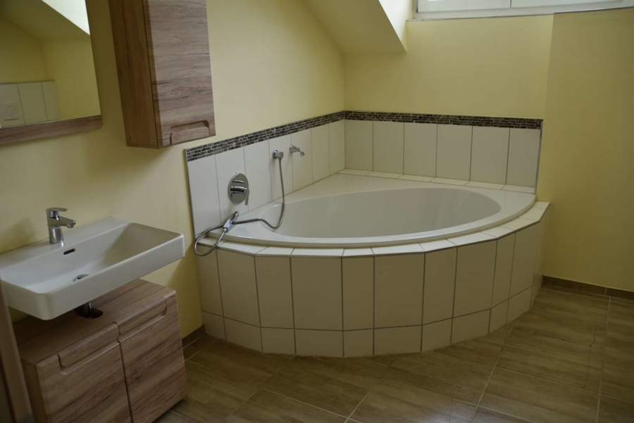 Im Obergeschoss finden Sie zwei Schlafzimmer, sowie ein Büro, Spielzimmer oder ähnliches vor. Ein geräumiges Badezimmer mit Eckbadezimmer befindet sich ebenfalls in modernem und sauberen Zustand.