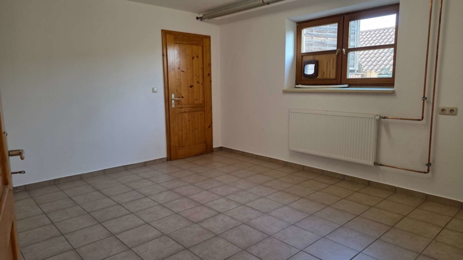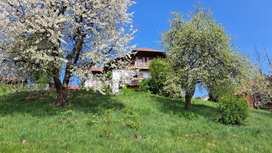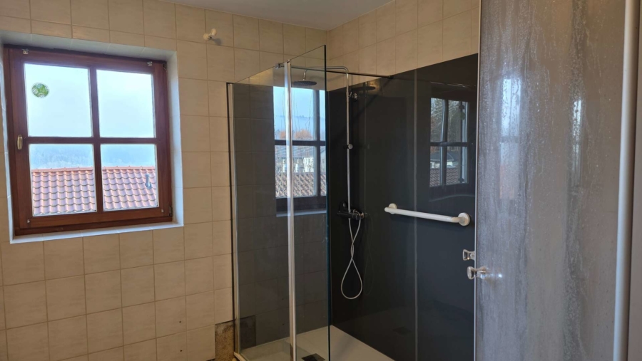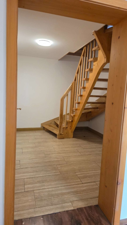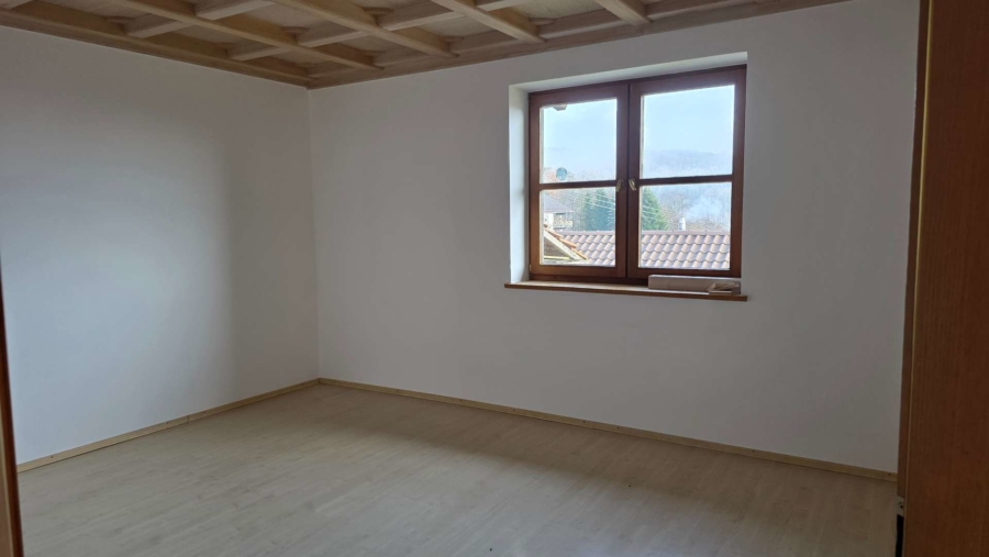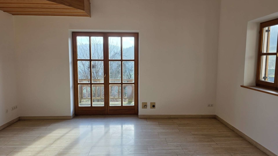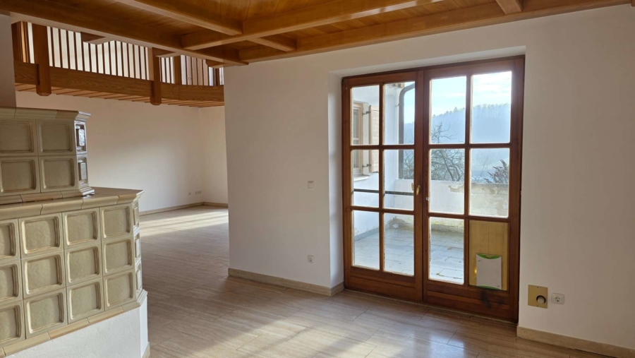 Beim Betreten des Erdgeschosses empfängt Sie ein einladender Flur, von dem aus alle Zimmer bequem erreichbar sind. Gleich am Eingang befindet sich ein zweckmäßiges Gäste-WC. Das Herzstück dieser Etage ist der große, sehr helle Wohn-Essbereich mit bodentiefen Holzfenstern, die nicht nur viel Licht hereinlassen, sondern auch den direkten Zugang zu einem Holzbalkon ermöglichen. Von hier führt eine Holztreppe auf eine gemütliche Galerie aus Holz mit weiterem Zugang zu einem Holzbalkon. Im Zentrum des Wohn-Essbereichs thront ein schöner beiger Kachelofen, der für wohlige Wärme und Gemütlichkeit sorgt. Vom Essbereich gelangen Sie auf einen Steinbalkon mit herrlichem Panoramablick. Angrenzend liegt die moderne Einbauküche mit praktischem Einbauschrank für Vorräte. Das Schlafzimmer verfügt über einen Zugang zum Balkon und Echtholzdielen, die für ein warmes Wohngefühl sorgen. Ein Kinderzimmer sowie ein großes Badezimmer mit Dusche und WC runden diese Etage ab; das Bad muss lediglich fertig saniert werden. Die Decken im Erdgeschoss sind mit sichtbaren Holzbalken gestaltet, manche sogar als handgearbeitete Vollholzdecken mit liebevollen Verzierungen – ein echter Hingucker.
