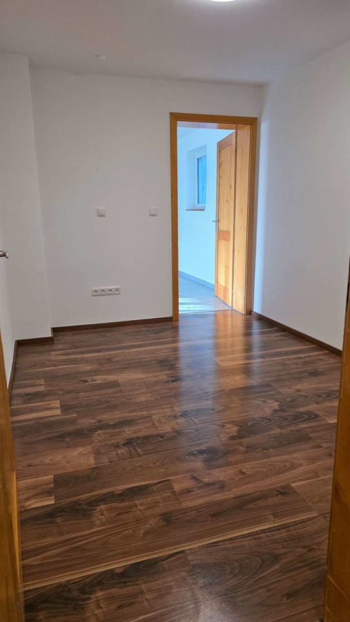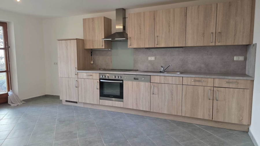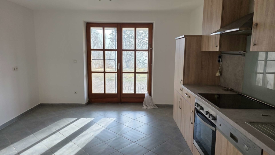 Die Wohnung besteht aus zwei hellen Zimmern mit bodentiefen Holzfenstern, die einen direkten Ausgang in den Garten ermöglichen. Die geräumige Küche ist mit einer Einbauküche ausgestattet und öffnet sich zur überdachten Terrasse – ideal für entspannte Stunden im Freien. Das zeitlose Badezimmer in Weiß verfügt über eine Badewanne und WC. Praktische Extras wie ein Abstellraum, eine Waschküche sowie weitere Kellerräume ergänzen das Angebot.