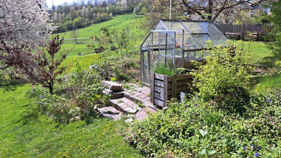 Außenbereiche: schöner grüner Garten mit kleinem Gewächshaus und einer Holzhütte;