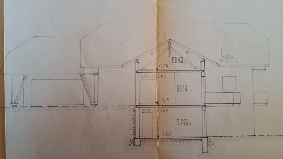 Etagen: 3 (Untergeschoss, Erdgeschoss, Dachgeschoss) – In den Hang gebaut, mit ebenerdigem Eingang im Erdgeschoss von vorne