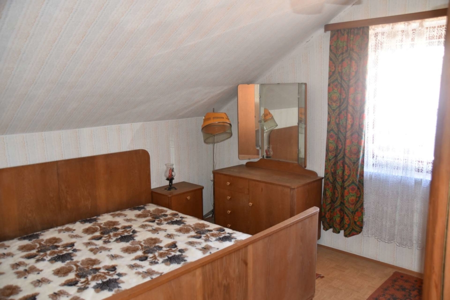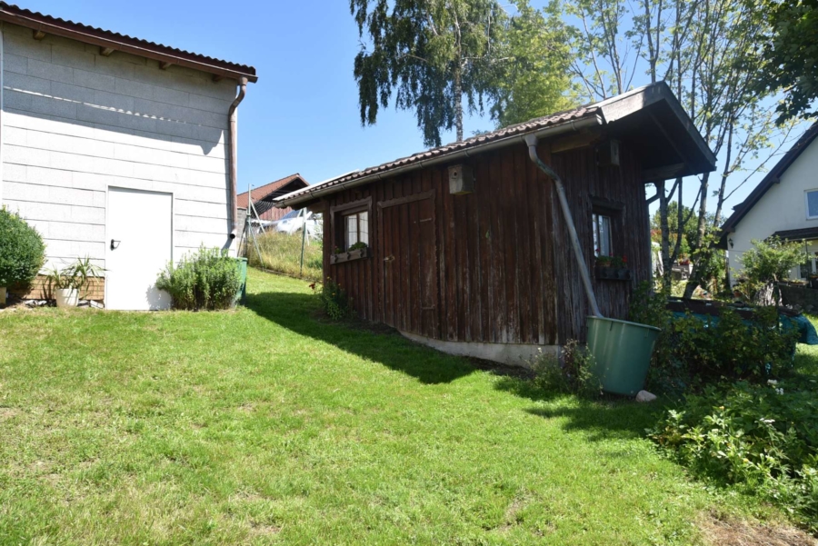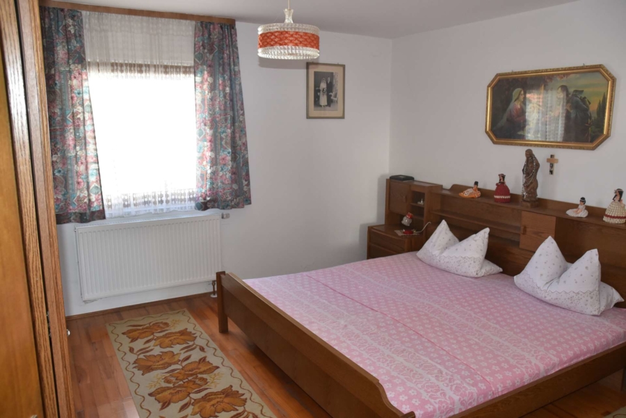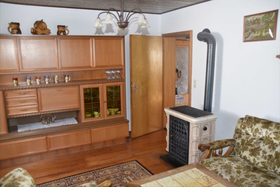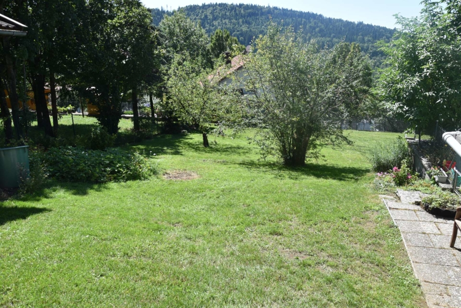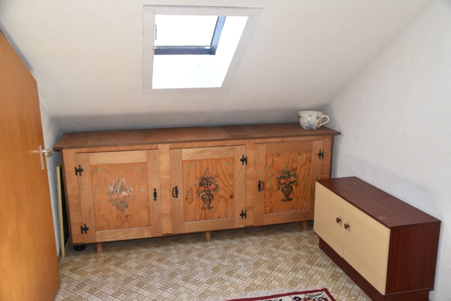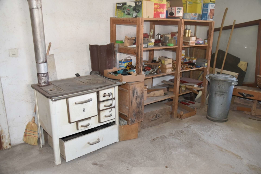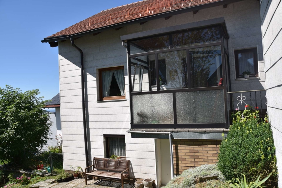 Im Obergeschoss befinden sich noch drei weitere Schlafzimmer und ein Badezimmer. Im Schafzimmer und Wohnzimmer des Erdgeschosses befindet sich ein schöner Holzparkettboden. Die Bäder des Hauses sind funktional und gepflegt im 70-iger Jahrestil gehalten. Die Zwischendecken sind betoniert was den soliden Zustand des Gebäudes unterstreicht. Im Jahr 2018 wurde die Öl-Zentral-Heizung mit allen Heizkörpern erstmals eingebaut. Zwei Heizöltanks mit je 3000 Liter Heizöl wurden ebenfalls eingebaut. Es stehen noch zusätzlich einzelne Holz-Einzelöfen im Gebäude zur Verfügung. Der Holzkochofen in der Küche wurde erst 2009 angeschafft. Das Dach des Hauses wurde 2010 neu eingeschalt und die Dachziegel wurden erneuert. Besonders erwähnertswert ist der schöne Ausblick aus allen Zimmer in Richtung Süd-Westen. Direkt vor dem Haus befindet sich ein großes Gemüsebeet welches sich problemlos zu einer großen Sonnenterrasse umgestalten lassen würde. Platz für Gemüsebeete wären auf dem über 861 m² großen Grundstück zu genüge vorhanden. Der Garten ist leicht hangig und wurde mit verschiedenen Obstbäumen bepflanzt. Ein geräumiges Gartenhaus finden sich ebenfalls vor. Neben dem Haus ist eine Einzelgarage in dessen Untergeschoss sich ein kleiner Geräteraum befindet. Der Zugang zum Haus wurde nachträglich mit einer Glasüberdachung versehen. Die kompletten Außenwände des Hauses wurden von allen vier Seiten mit einer Wetterschutzfassade verkleidet. Das Haus befindet sich aufgrund des Alters in einem gepflegtem aber renovierungsbedürftigem Zustand.