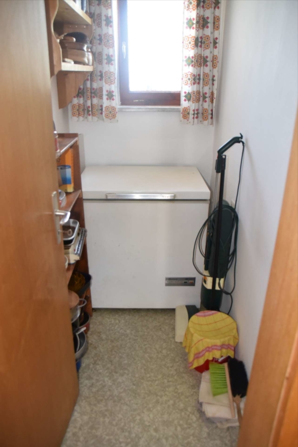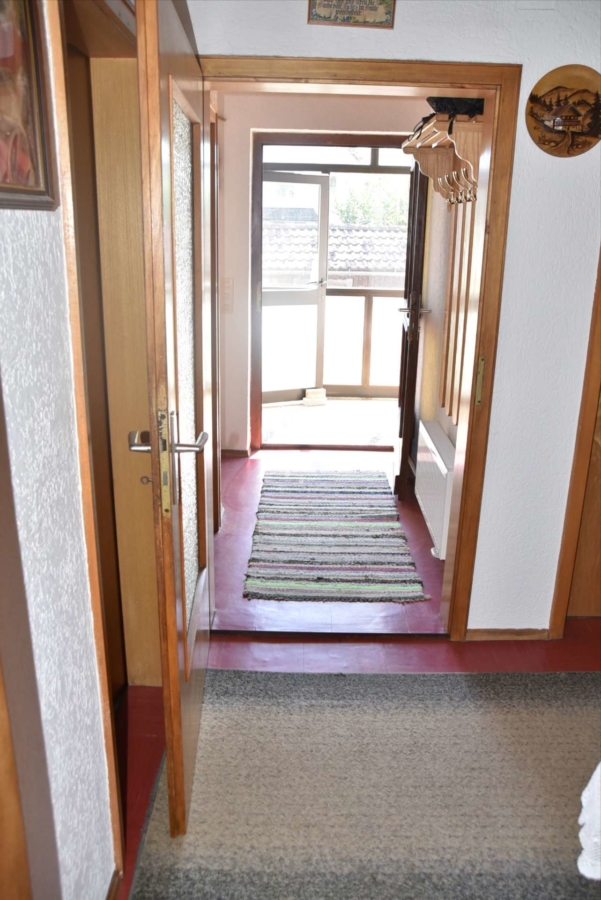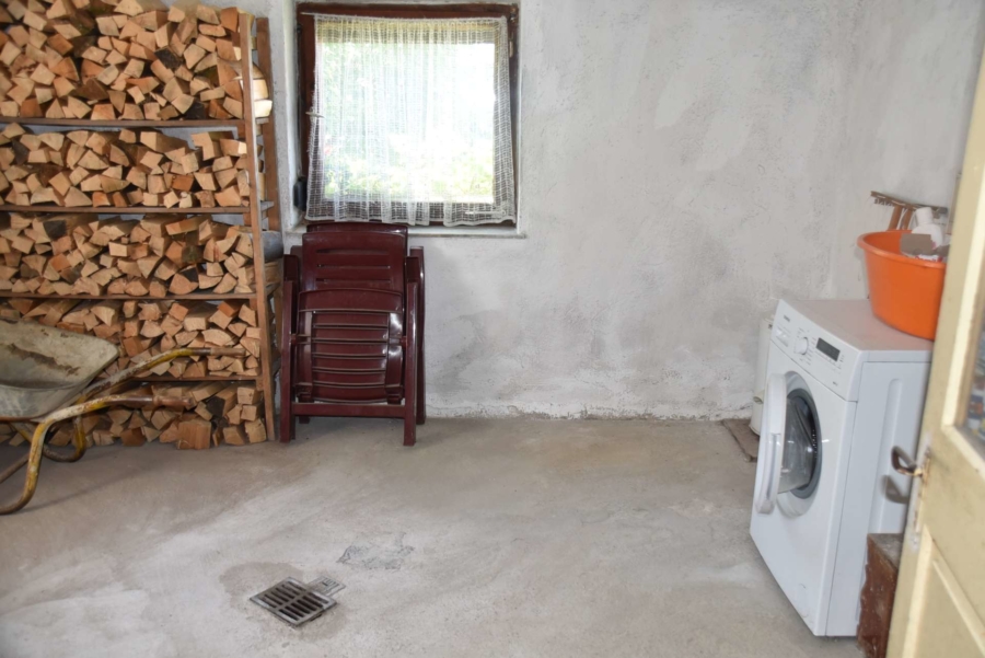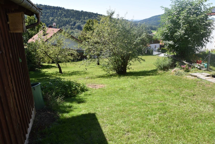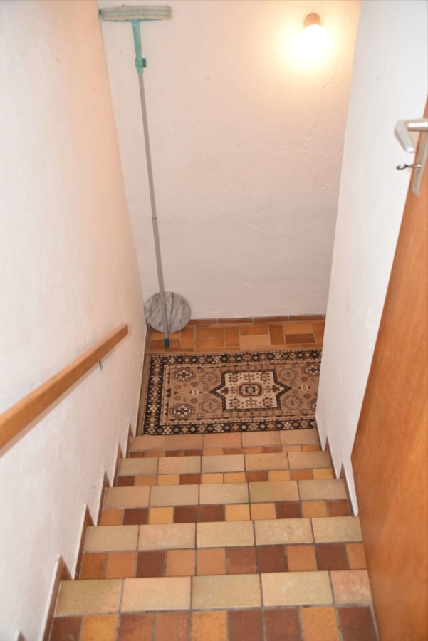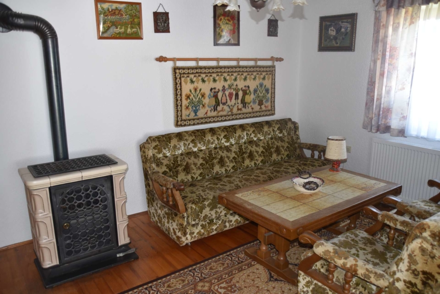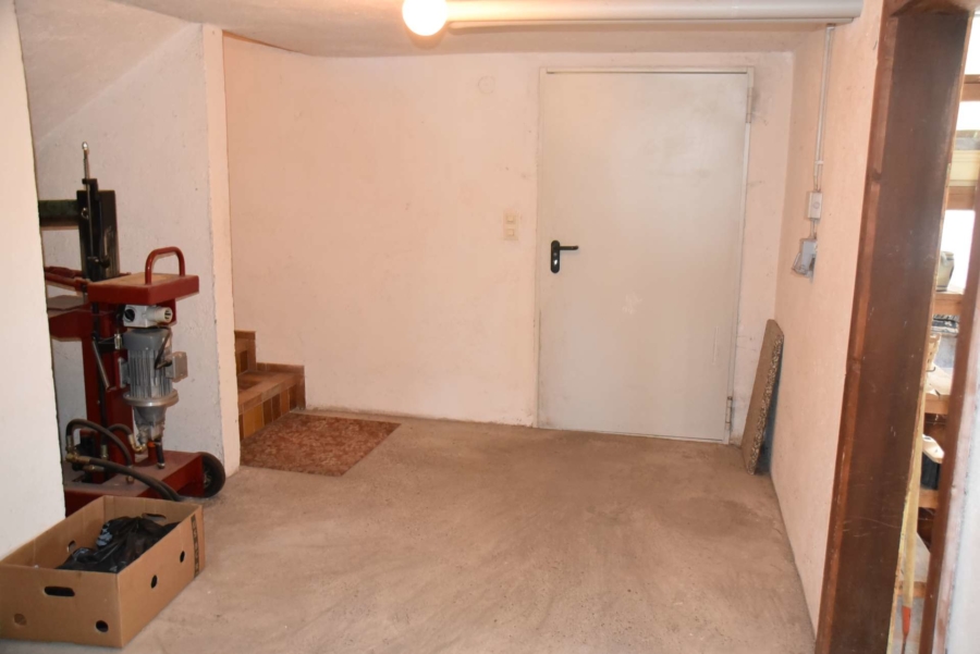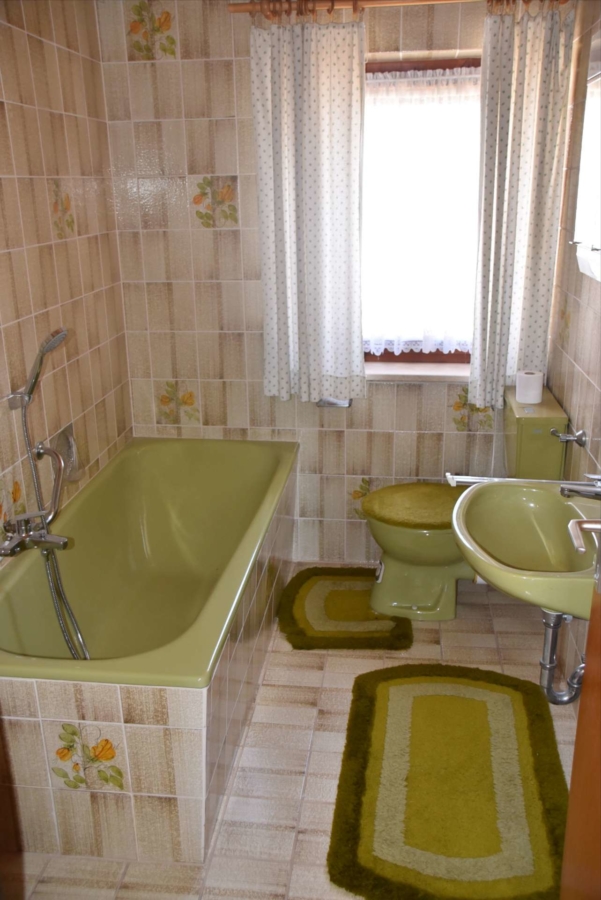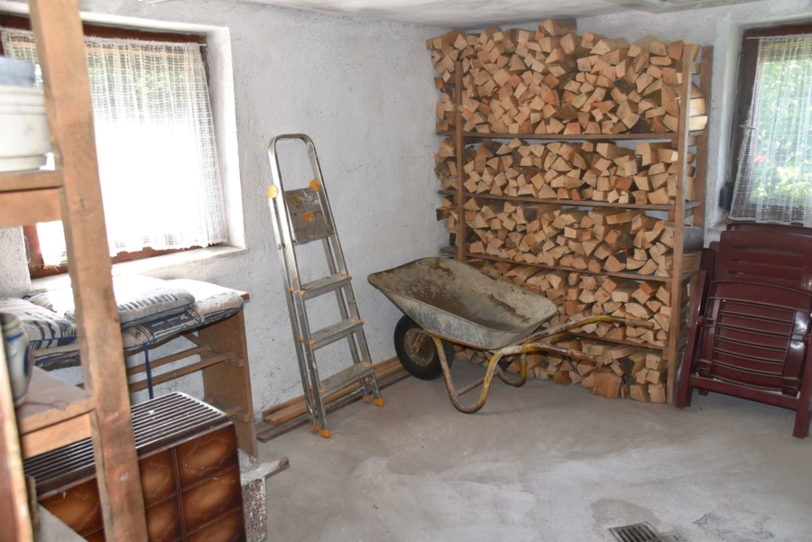 Im Obergeschoss befinden sich noch drei weitere Schlafzimmer und ein Badezimmer. Im Schafzimmer und Wohnzimmer des Erdgeschosses befindet sich ein schöner Holzparkettboden. Die Bäder des Hauses sind funktional und gepflegt im 70-iger Jahrestil gehalten. Die Zwischendecken sind betoniert was den soliden Zustand des Gebäudes unterstreicht. Im Jahr 2018 wurde die Öl-Zentral-Heizung mit allen Heizkörpern erstmals eingebaut. Zwei Heizöltanks mit je 3000 Liter Heizöl wurden ebenfalls eingebaut. Es stehen noch zusätzlich einzelne Holz-Einzelöfen im Gebäude zur Verfügung. Der Holzkochofen in der Küche wurde erst 2009 angeschafft. Das Dach des Hauses wurde 2010 neu eingeschalt und die Dachziegel wurden erneuert. Besonders erwähnertswert ist der schöne Ausblick aus allen Zimmer in Richtung Süd-Westen. Direkt vor dem Haus befindet sich ein großes Gemüsebeet welches sich problemlos zu einer großen Sonnenterrasse umgestalten lassen würde. Platz für Gemüsebeete wären auf dem über 861 m² großen Grundstück zu genüge vorhanden. Der Garten ist leicht hangig und wurde mit verschiedenen Obstbäumen bepflanzt. Ein geräumiges Gartenhaus finden sich ebenfalls vor. Neben dem Haus ist eine Einzelgarage in dessen Untergeschoss sich ein kleiner Geräteraum befindet. Der Zugang zum Haus wurde nachträglich mit einer Glasüberdachung versehen. Die kompletten Außenwände des Hauses wurden von allen vier Seiten mit einer Wetterschutzfassade verkleidet. Das Haus befindet sich aufgrund des Alters in einem gepflegtem aber renovierungsbedürftigem Zustand.