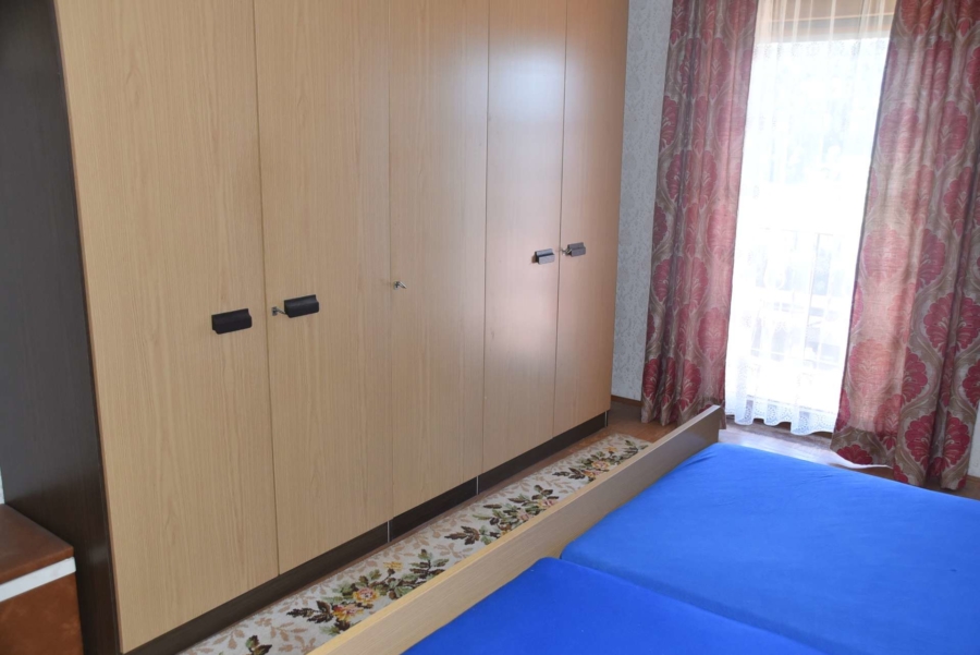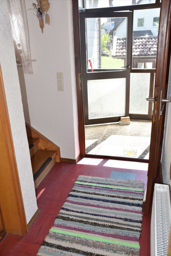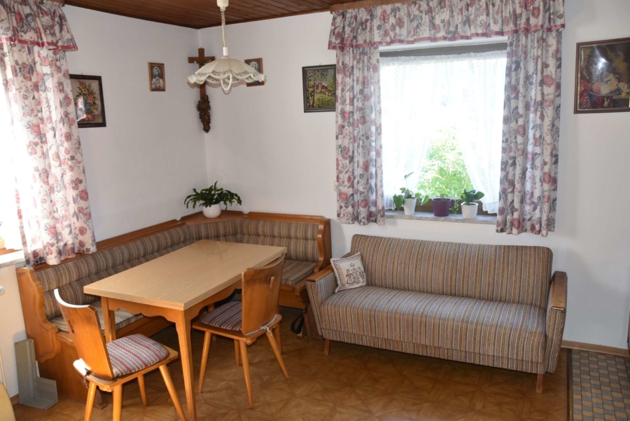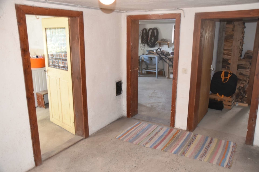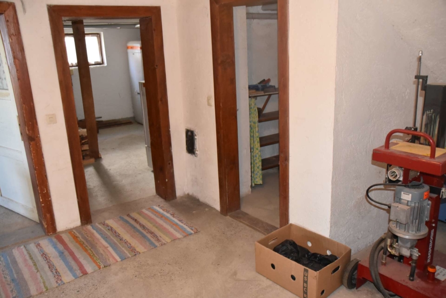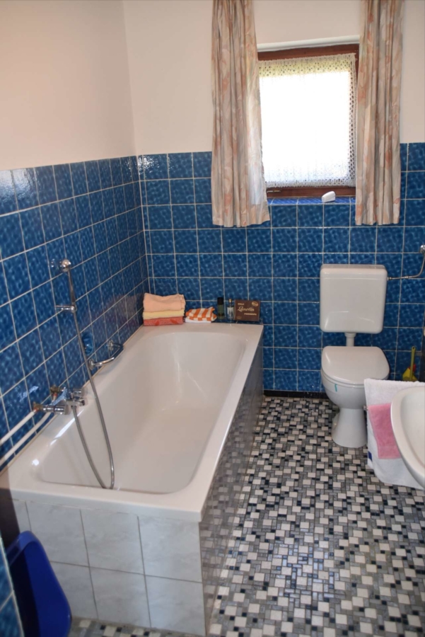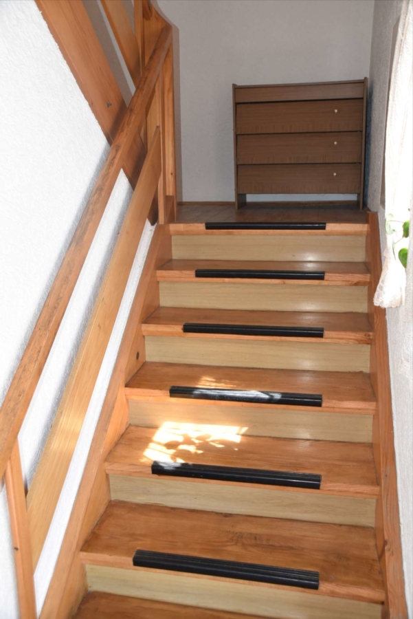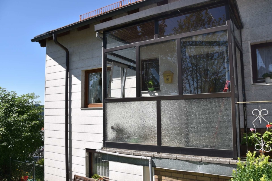 Im Obergeschoss befinden sich noch drei weitere Schlafzimmer und ein Badezimmer. Im Schafzimmer und Wohnzimmer des Erdgeschosses befindet sich ein schöner Holzparkettboden. Die Bäder des Hauses sind funktional und gepflegt im 70-iger Jahrestil gehalten. Die Zwischendecken sind betoniert was den soliden Zustand des Gebäudes unterstreicht. Im Jahr 2018 wurde die Öl-Zentral-Heizung mit allen Heizkörpern erstmals eingebaut. Zwei Heizöltanks mit je 3000 Liter Heizöl wurden ebenfalls eingebaut. Es stehen noch zusätzlich einzelne Holz-Einzelöfen im Gebäude zur Verfügung. Der Holzkochofen in der Küche wurde erst 2009 angeschafft. Das Dach des Hauses wurde 2010 neu eingeschalt und die Dachziegel wurden erneuert. Besonders erwähnertswert ist der schöne Ausblick aus allen Zimmer in Richtung Süd-Westen. Direkt vor dem Haus befindet sich ein großes Gemüsebeet welches sich problemlos zu einer großen Sonnenterrasse umgestalten lassen würde. Platz für Gemüsebeete wären auf dem über 861 m² großen Grundstück zu genüge vorhanden. Der Garten ist leicht hangig und wurde mit verschiedenen Obstbäumen bepflanzt. Ein geräumiges Gartenhaus finden sich ebenfalls vor. Neben dem Haus ist eine Einzelgarage in dessen Untergeschoss sich ein kleiner Geräteraum befindet. Der Zugang zum Haus wurde nachträglich mit einer Glasüberdachung versehen. Die kompletten Außenwände des Hauses wurden von allen vier Seiten mit einer Wetterschutzfassade verkleidet. Das Haus befindet sich aufgrund des Alters in einem gepflegtem aber renovierungsbedürftigem Zustand.