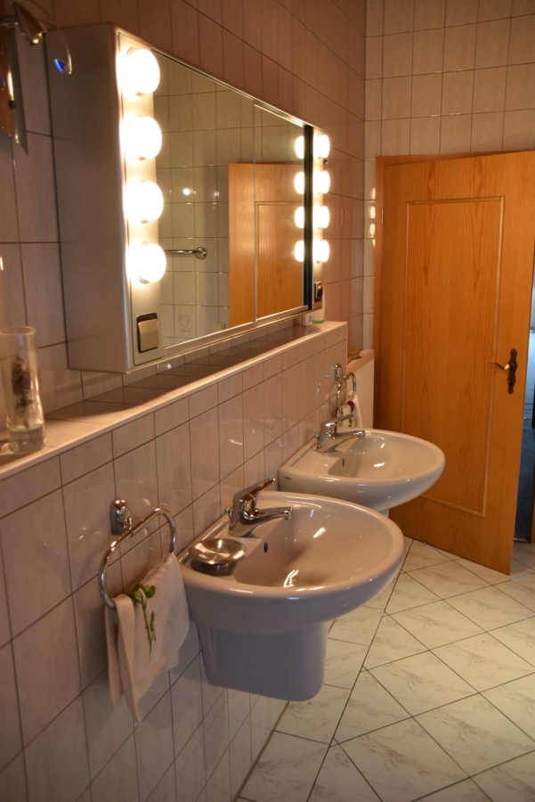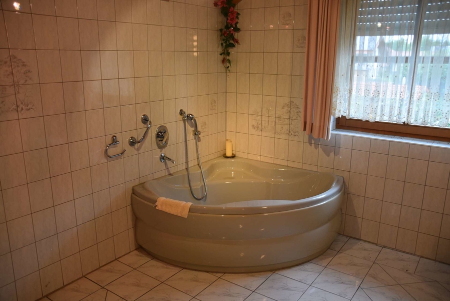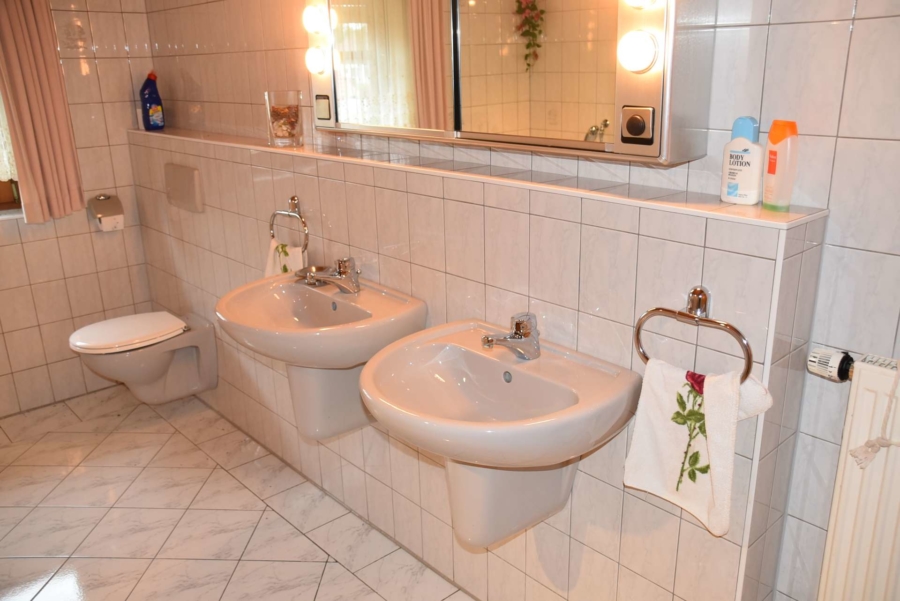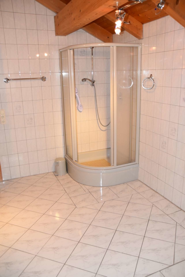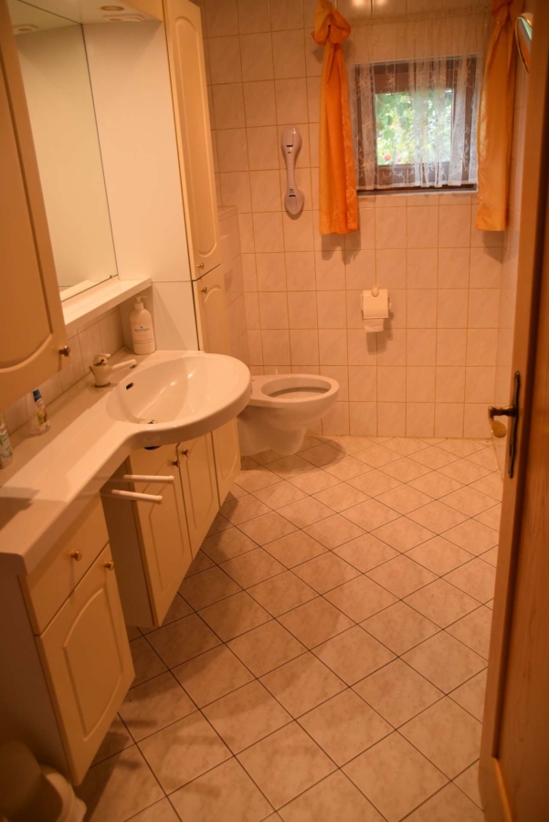 Im Obergeschoß finden Sie die Schlafräume und das Hauptbadezimmer mit Eckbadewanne und Dusche. Im Erdgeschoss befindet sich eine Gäste WC. Die Bäder sind mit zeitlosen Fliesen ausgestattet. Durch die Aufdachisolierung hat man Im gesamten Obergeschoß freien Blick auf den Sichtdachstuhl.