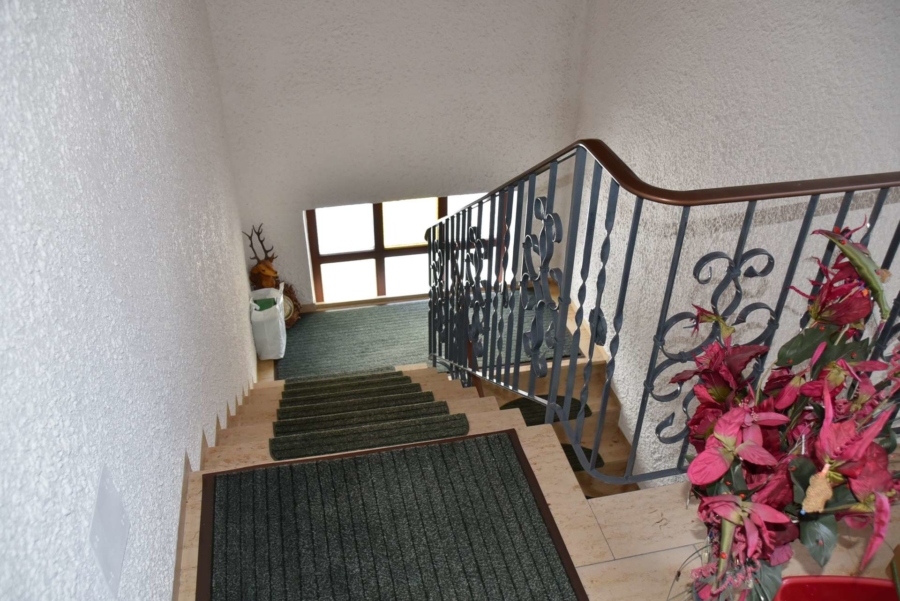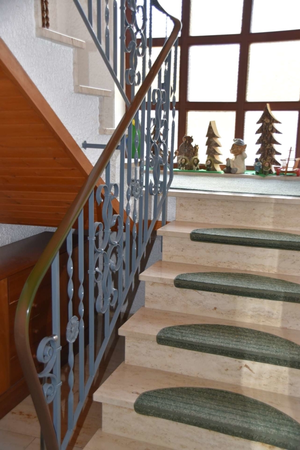 Über das Treppenhaus erreicht man die Wohnung im Erdgeschoss. Diese Wohnung ist ca 110 m² groß und verfügt über insgesamt fünf Zimmer, einem Esszimmer und angrenzender Küche. Der großzügige Balkon erstreckt sich um zwei Seiten des Gebäudes.