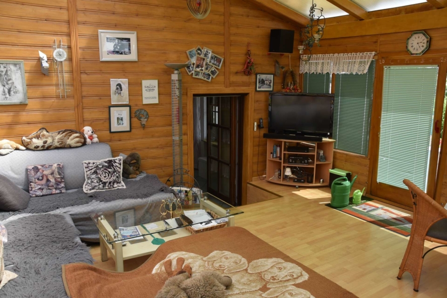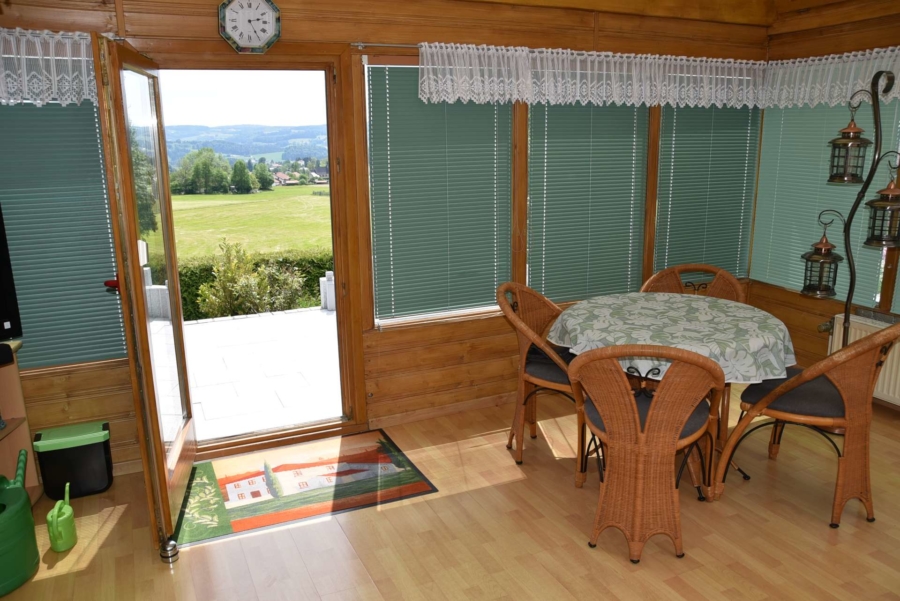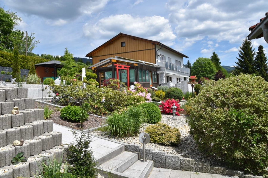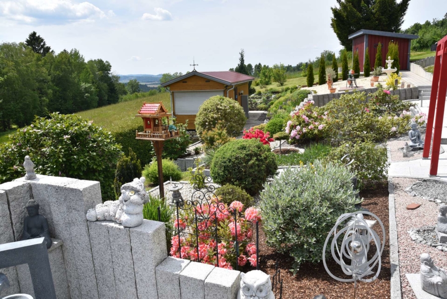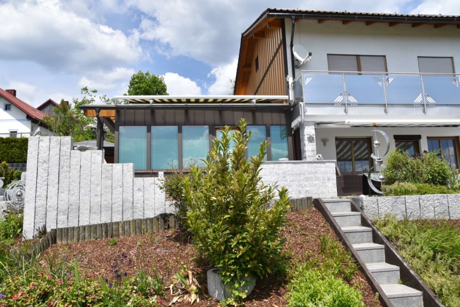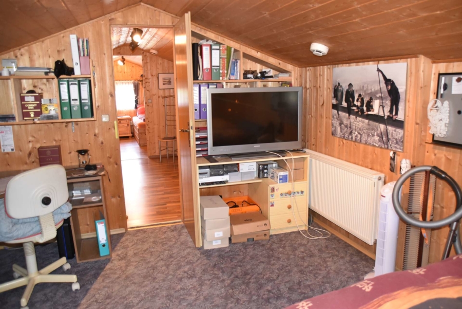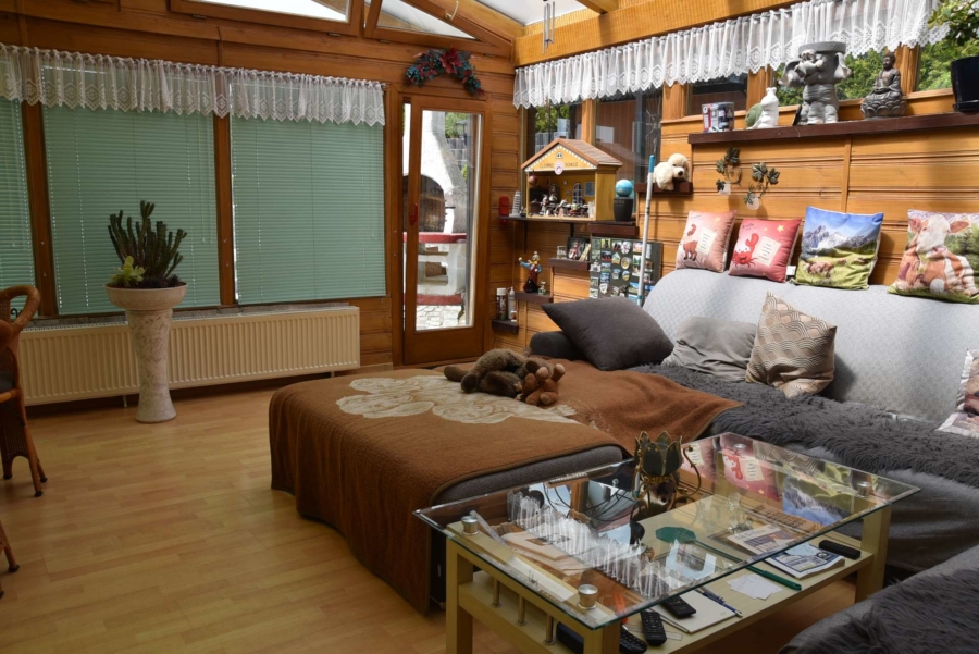 Derzeit wird das Haus als Einfamilienhaus genutzt bei dem sich der großzügige Wohnbereich mit herrlichem Wintergarten und automatischer Beschattung im unteren Geschoss befinden. Die Schlafräume liegen im Erdgeschoss. Es wäre aber denkbar die Immobilie als Zwei-Familienhaus auf zwei Etagen zu nutzen. Während das UG im Laufe der Jahre umfangreich saniert wurde findet man im EG in manchen Räumen noch einige Renovierungsarbeiten vor. Das Badezimmer im UG wurde bereits saniert. Das Badezimmer im EG und das Gäste-WC befinden sich im Stil der 70-iger Jahre. Im Dachgeschoss wurden nachträglich zwei Gästezimmer ausgebaut. Das Haus wird mit einer modernen Pellets-Zentralheizung beheizt und hat zusätzlich einen gemütlichen Kachelofen im Wohnbereich. Die moderne Einbauküche im UG ist im Kaufpreis enthalten. Das Gebäude wurde an der Süd-/und Westseite mit einem Vollwärmeschutz verkleidet und eine Wetterschutzverkleidung befindet sich an der Westseite. Die Fenster wurden bereits 1992 gegen hochwertige Kunststoffisolierglasfenster erneuert. Die Terrasse und der aufwendig angelegte Garten sind ein wahrer Traum und lassen keinerlei Wünsche offen. Die direkt angrenzenden großzügigen Wiesenflächen eignen sich hervorragend für Pferdehaltung oder anderweitige Tierhaltung. Ein vollausgestattetes, tolles Tinyhaus mit Küche, Badezimmer, Schlafzimmer und Wohnbereich befindet sich ebenfalls auf dem weitläufigen Gelände mit toller Fernsicht. Zusätzlich ist noch Gerätehaus, eine Holzlege mit Partyraum auf dem Grundstück.