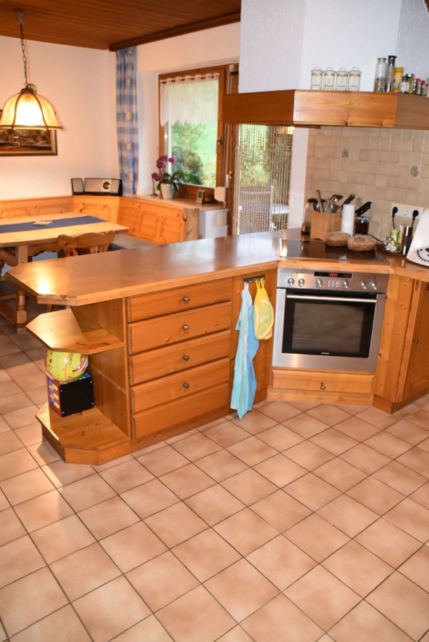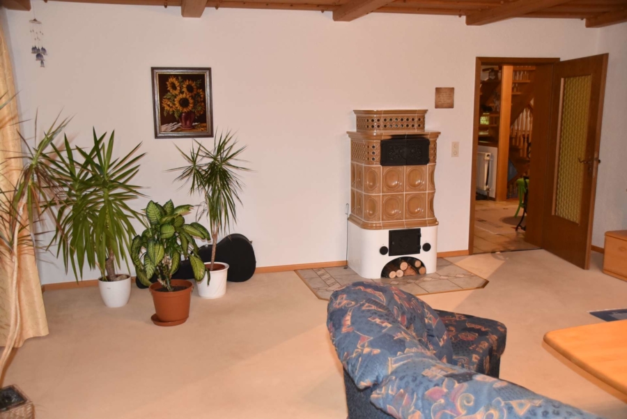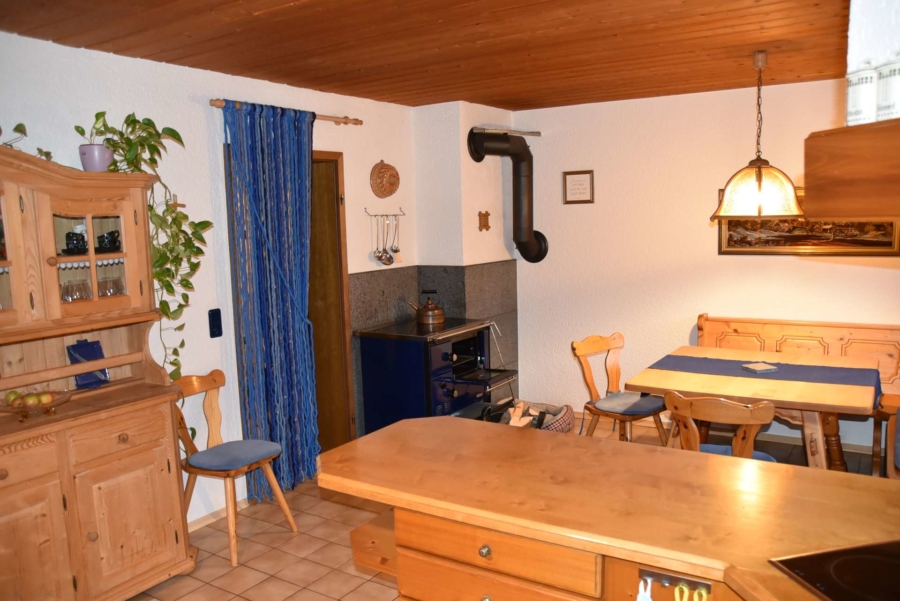 In der Küche ist ein zusätzlicher Holzofen mit Cerankochfeld. Im Wohnzimmer sorgt ein Kachelofen für Wärme an kalten Tagen.