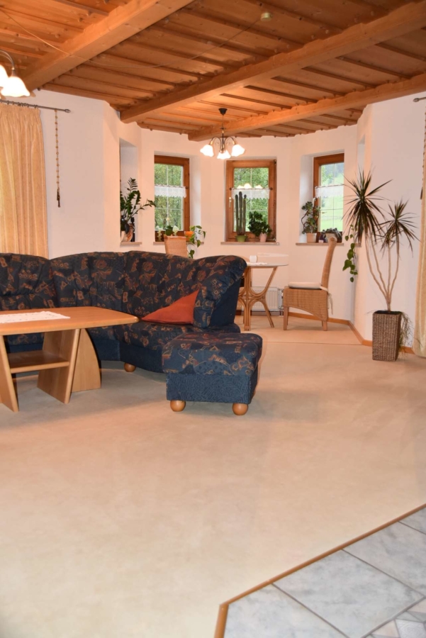 Das Wohnzimmer ist ebenfalls großzügig und bietet mit einem Erker Platz für eine separate Sitzgarnitur.