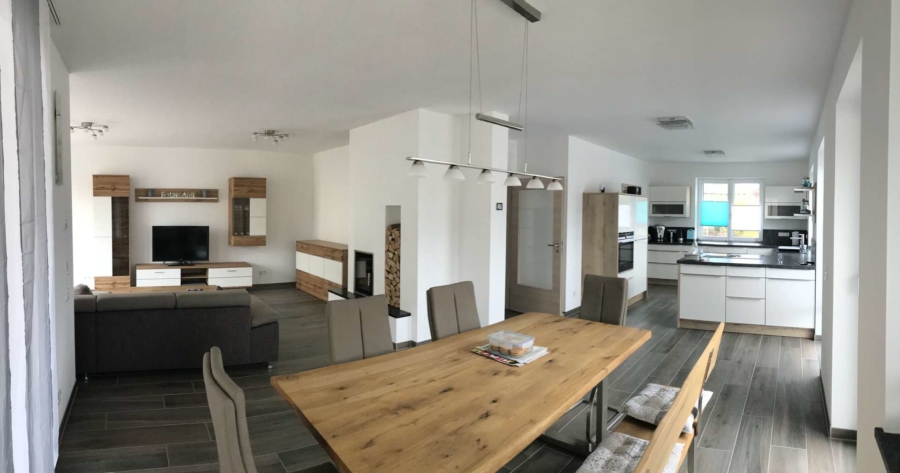 teilmöbliert (Wohnzimmer, Esszimmer, Bad/Schleuße, Schlafzimmer), hochwertige Einbauküche, Badewanne, Dusche, Gäste-WC, Fußbodenheizung, Kachelofen, Erdgeschoss komplett gefliest, Doppelgarage, Garten, Terrasse,