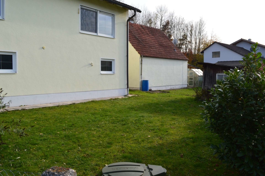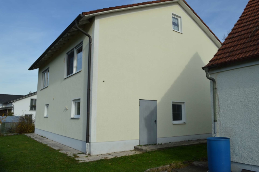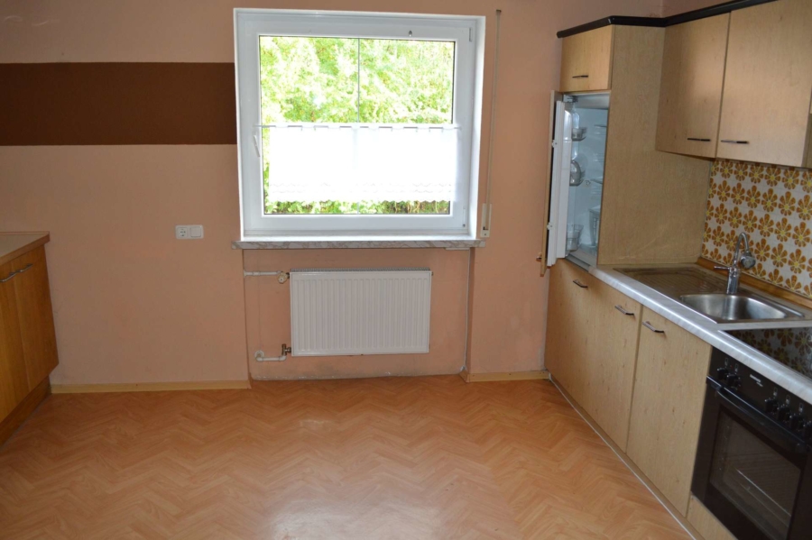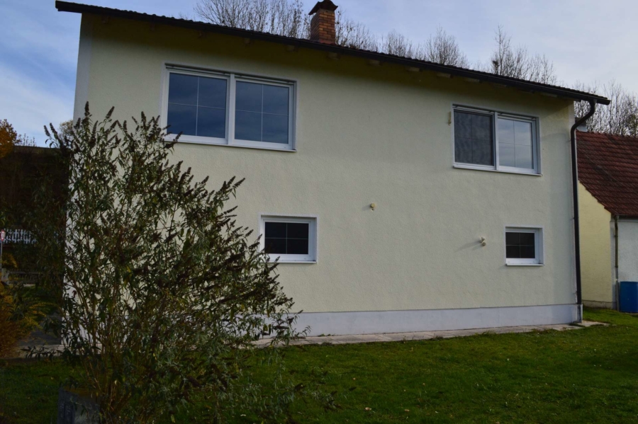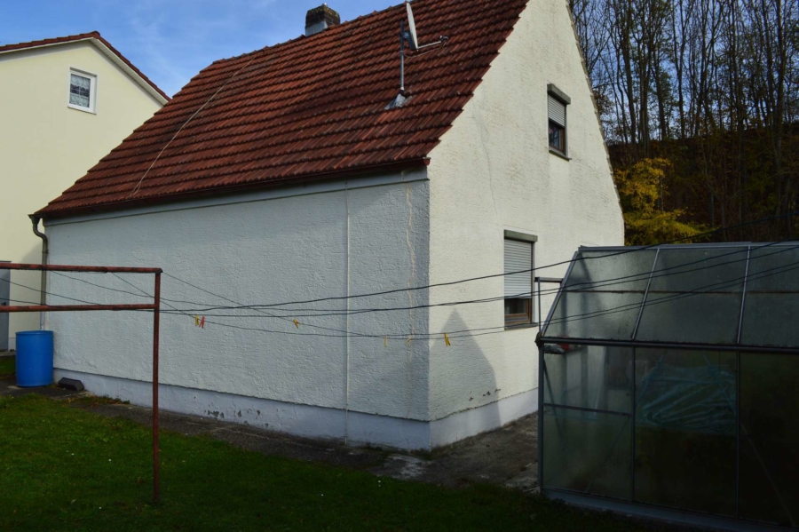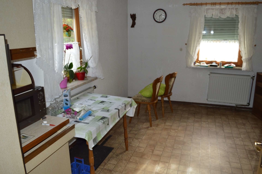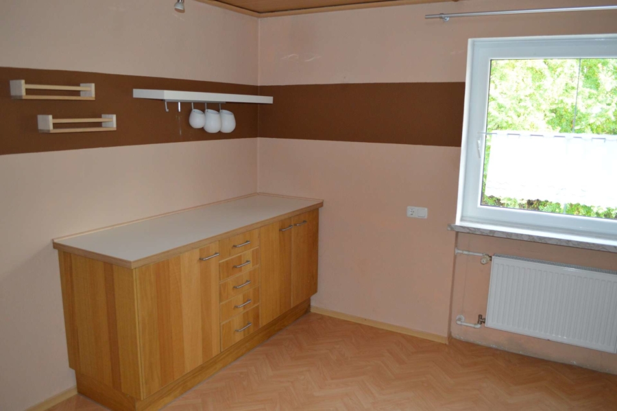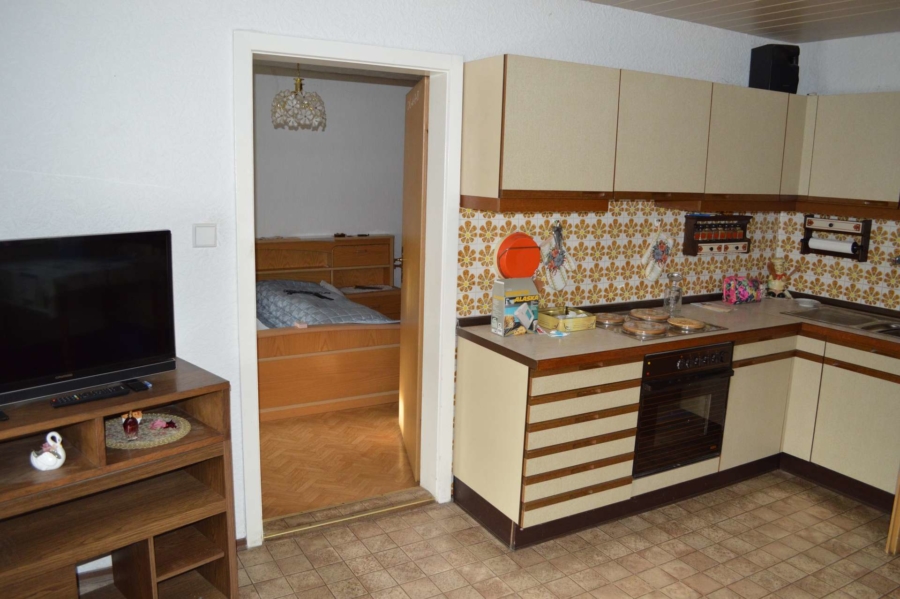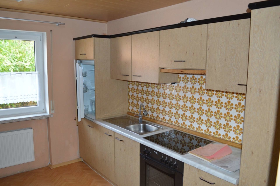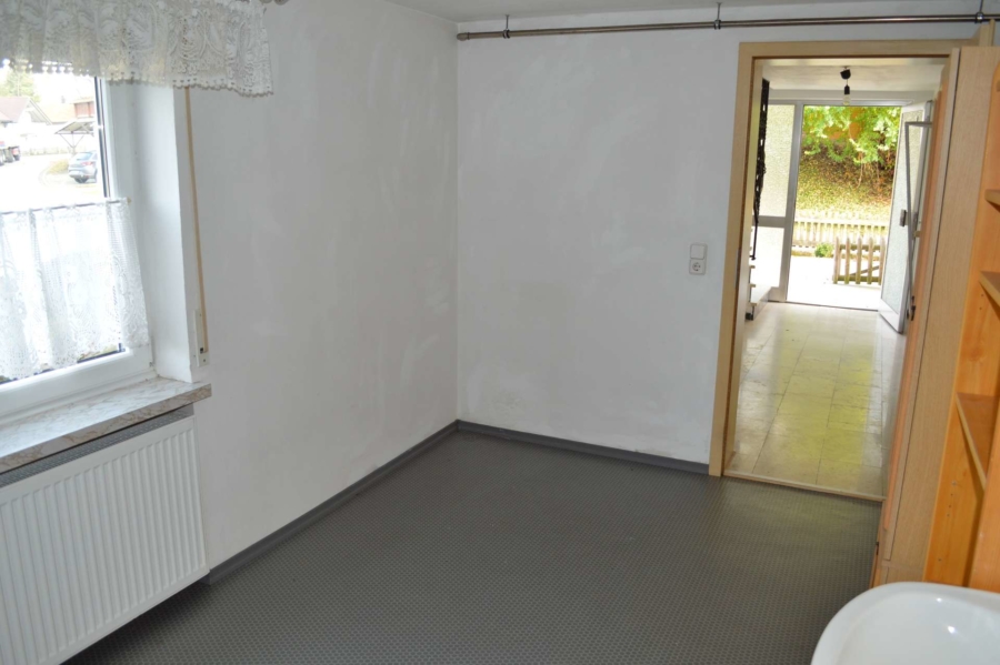 Diese Immobilie besteht aus zwei, in Massivbauweise errichteten Häusern. Das neuere der beiden wurde 1975 erbaut. 2003 wurde es komplett neu saniert. Im Erdgesschoss befinden sich zwei großzügigen Garagen mit elektrischen Toren. Hinter den Garagenräumen sind die Öl Zentralheizung und die Heizöltanks untergebracht. Ebensfalls findet man hier wertvollen Stauraum für Fahrräder, Gartengeräte und vieles weitere. Rechts neben den Garagen ist die Hauseingangstüre. Im Erdgeschoss ist ein großer, heller Hauswirtschaftsraum untergebracht. Unter der Treppe, die in den Wohnbereich in das Obergeschoss führt, ist ein kleiner Technikraum, in dem der Wasser und Elektroanschluss untergebracht ist. Vor der Wohnungtüre im Obergeschoss ist eine kleiner praktischer Vorraum. Betritt man die Wohnung, findet man im ersten Raum links einen geräumigen hellen Küchenraum, der bereits mit einer Einbauküche ausgestattet ist. Ausreichend Platz für einen Esstisch wäre ebenfalls vorhanden. Gegenüber kommt man direkt in ein großes, lichtdurchflutetes Wohnzimmer, welches mit hellen Laminatboden ausgestattet ist. Im zweiten Zimmer rechts gelangt man in das das geräumige Schlafzimmer, auf der anderen Flurseite in das moderne, gepflegte Badezimmer mit Fenster, Dusche, Wanne und WC. Am Ende des Flures ist ein ein weiteres Zimmer zu finden, welches sich optimal als Büro, Kinderzimmer oder Gästezimmer eignet.