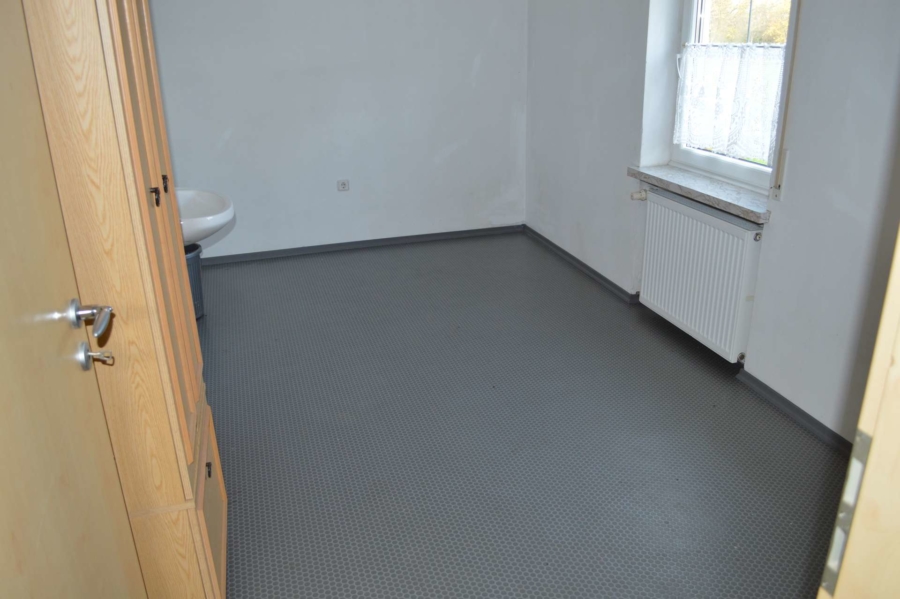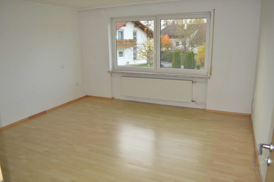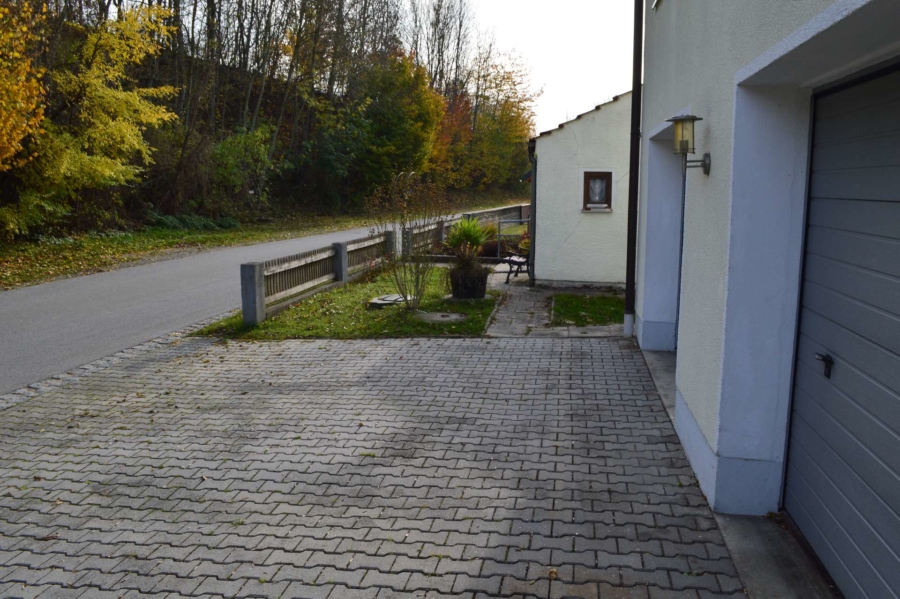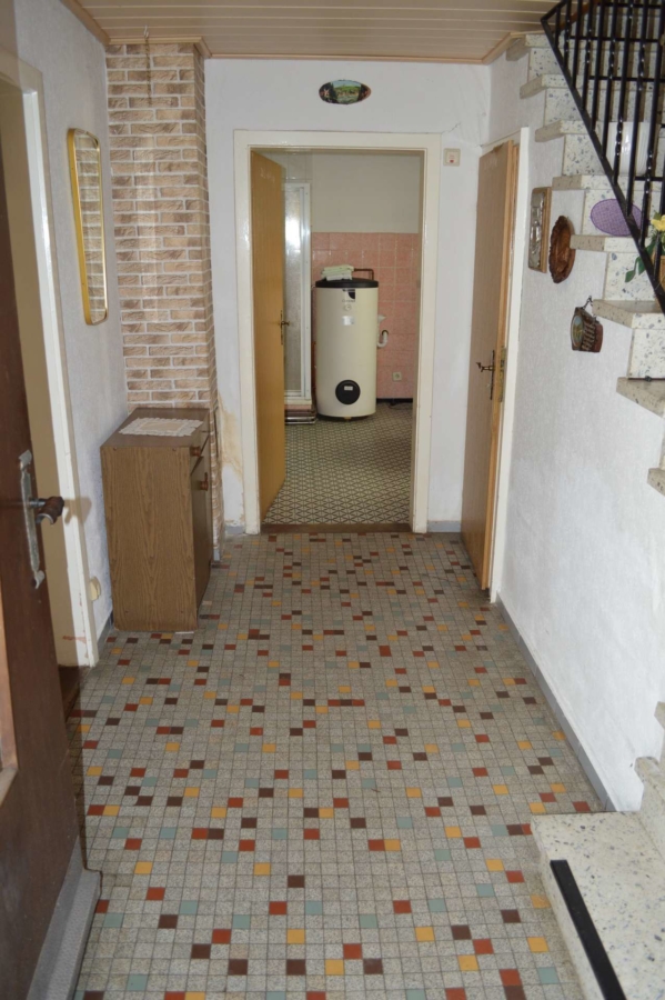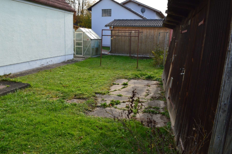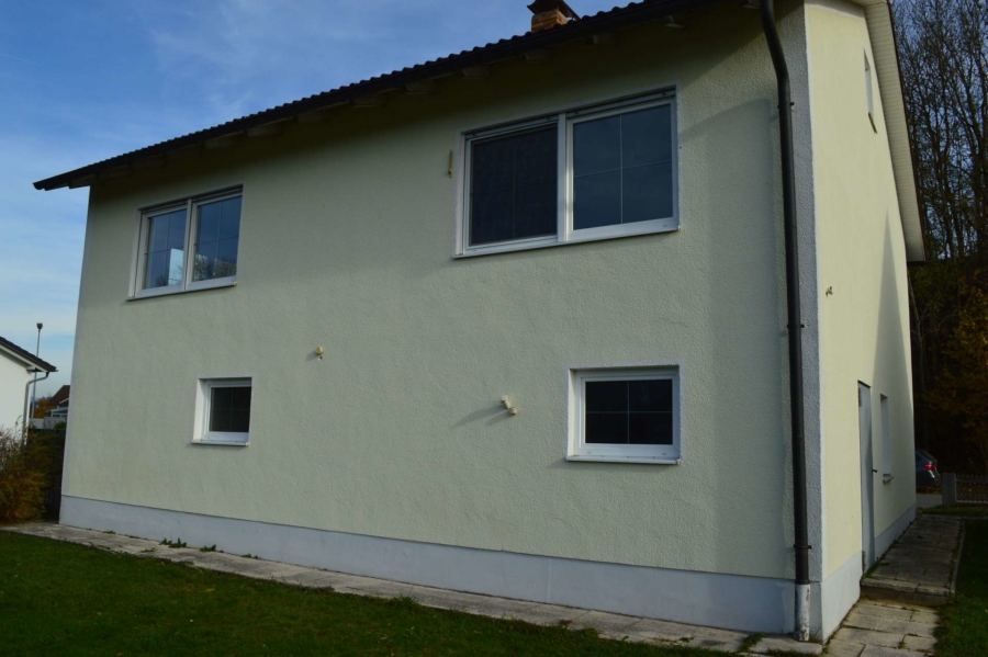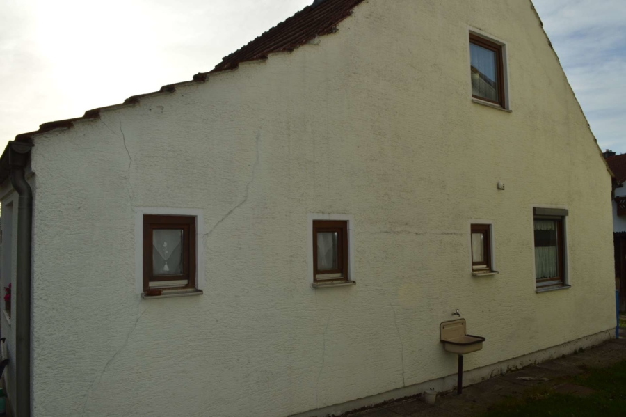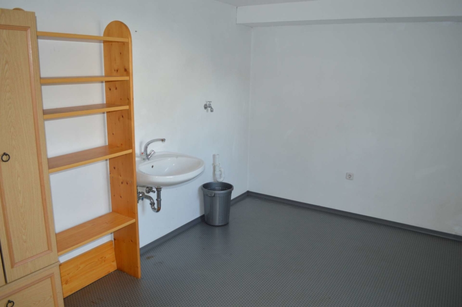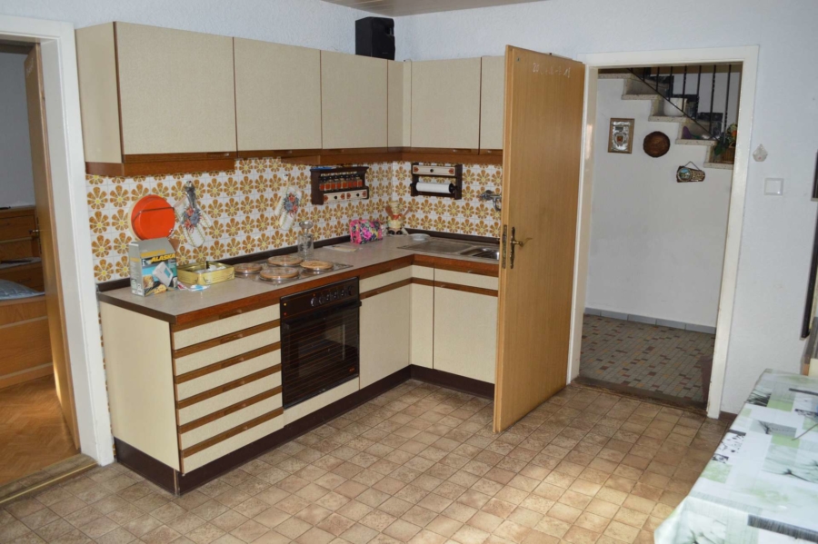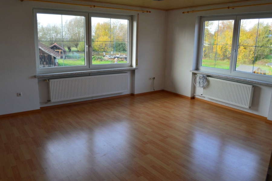 Diese Immobilie besteht aus zwei, in Massivbauweise errichteten Häusern. Das neuere der beiden wurde 1975 erbaut. 2003 wurde es komplett neu saniert. Im Erdgesschoss befinden sich zwei großzügigen Garagen mit elektrischen Toren. Hinter den Garagenräumen sind die Öl Zentralheizung und die Heizöltanks untergebracht. Ebensfalls findet man hier wertvollen Stauraum für Fahrräder, Gartengeräte und vieles weitere. Rechts neben den Garagen ist die Hauseingangstüre. Im Erdgeschoss ist ein großer, heller Hauswirtschaftsraum untergebracht. Unter der Treppe, die in den Wohnbereich in das Obergeschoss führt, ist ein kleiner Technikraum, in dem der Wasser und Elektroanschluss untergebracht ist. Vor der Wohnungtüre im Obergeschoss ist eine kleiner praktischer Vorraum. Betritt man die Wohnung, findet man im ersten Raum links einen geräumigen hellen Küchenraum, der bereits mit einer Einbauküche ausgestattet ist. Ausreichend Platz für einen Esstisch wäre ebenfalls vorhanden. Gegenüber kommt man direkt in ein großes, lichtdurchflutetes Wohnzimmer, welches mit hellen Laminatboden ausgestattet ist. Im zweiten Zimmer rechts gelangt man in das das geräumige Schlafzimmer, auf der anderen Flurseite in das moderne, gepflegte Badezimmer mit Fenster, Dusche, Wanne und WC. Am Ende des Flures ist ein ein weiteres Zimmer zu finden, welches sich optimal als Büro, Kinderzimmer oder Gästezimmer eignet.