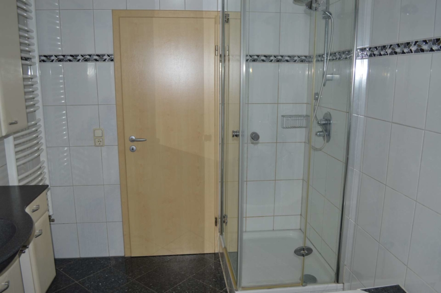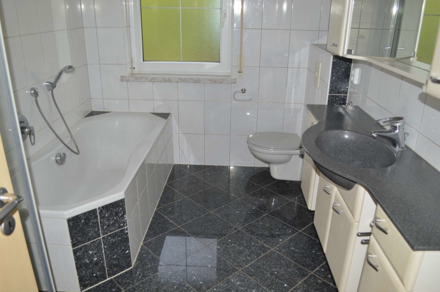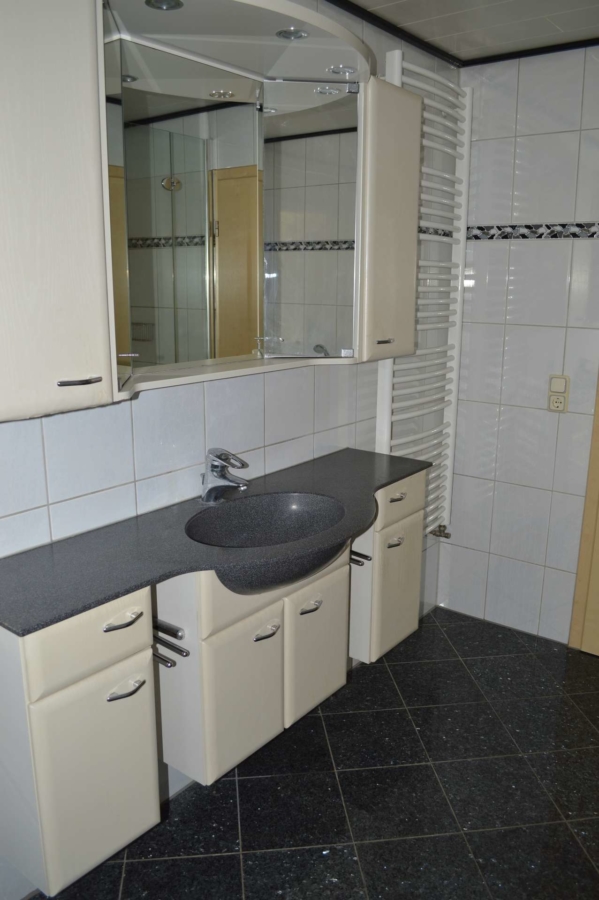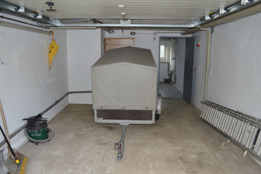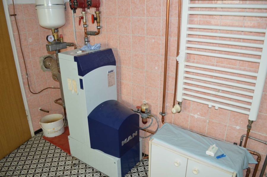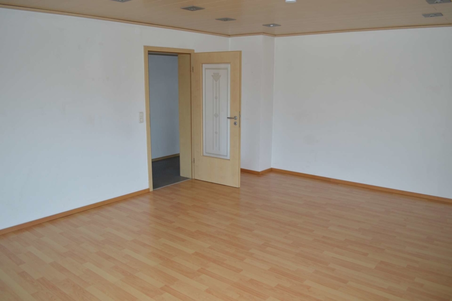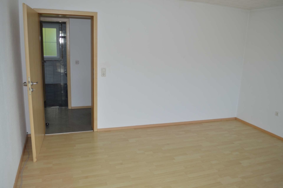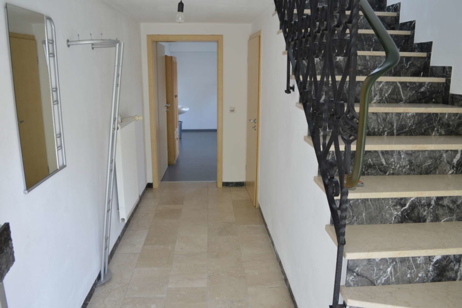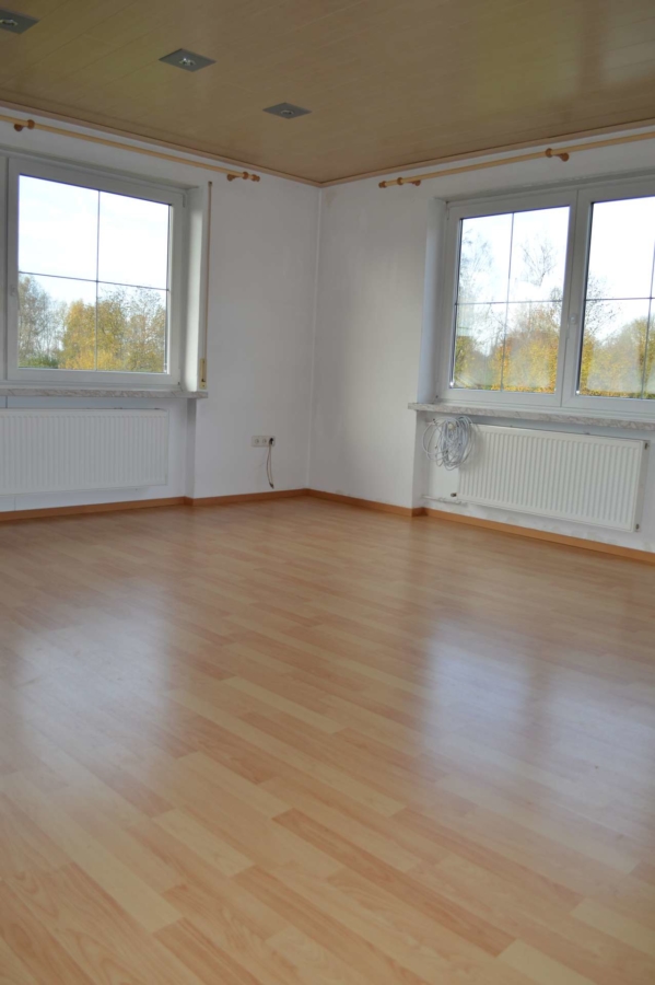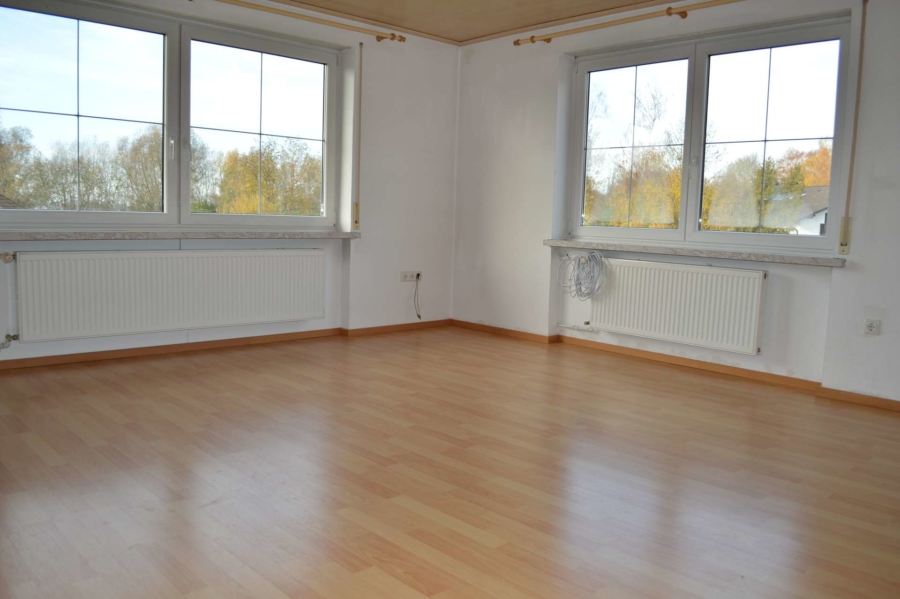 Diese Immobilie besteht aus zwei, in Massivbauweise errichteten Häusern. Das neuere der beiden wurde 1975 erbaut. 2003 wurde es komplett neu saniert. Im Erdgesschoss befinden sich zwei großzügigen Garagen mit elektrischen Toren. Hinter den Garagenräumen sind die Öl Zentralheizung und die Heizöltanks untergebracht. Ebensfalls findet man hier wertvollen Stauraum für Fahrräder, Gartengeräte und vieles weitere. Rechts neben den Garagen ist die Hauseingangstüre. Im Erdgeschoss ist ein großer, heller Hauswirtschaftsraum untergebracht. Unter der Treppe, die in den Wohnbereich in das Obergeschoss führt, ist ein kleiner Technikraum, in dem der Wasser und Elektroanschluss untergebracht ist. Vor der Wohnungtüre im Obergeschoss ist eine kleiner praktischer Vorraum. Betritt man die Wohnung, findet man im ersten Raum links einen geräumigen hellen Küchenraum, der bereits mit einer Einbauküche ausgestattet ist. Ausreichend Platz für einen Esstisch wäre ebenfalls vorhanden. Gegenüber kommt man direkt in ein großes, lichtdurchflutetes Wohnzimmer, welches mit hellen Laminatboden ausgestattet ist. Im zweiten Zimmer rechts gelangt man in das das geräumige Schlafzimmer, auf der anderen Flurseite in das moderne, gepflegte Badezimmer mit Fenster, Dusche, Wanne und WC. Am Ende des Flures ist ein ein weiteres Zimmer zu finden, welches sich optimal als Büro, Kinderzimmer oder Gästezimmer eignet.