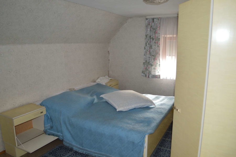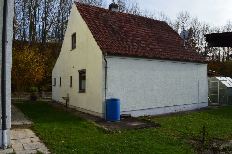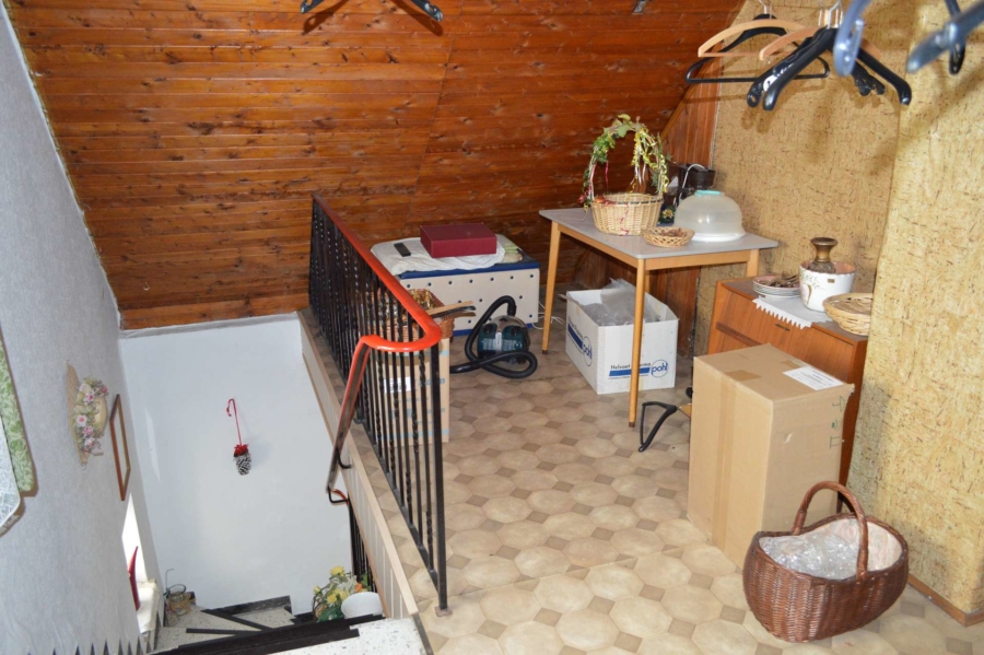 Das zweite Häuschen auf dem Grundstück wurde ca. 1960 erbaut. Es befindet sich in renovierungsbedürftigem, aber nicht schlechtem Zustand. Es wäre sofort bewohnbar. So wurden bereits neue Holz Isolierglasfenster eingebaut und eine Öl Zentralheizung. Vor dem Eingang ist eine kleiner Windfang mit Abstellkammer zu finden. Im ersten Zimmer links ist eine Wohnküche untergebracht und daneben ein kleines Wohn- oder Schlafzimmer. Im hinteren Bereich ist das geräumige Badezimmer zu finden sowie die Heizanlage nebst Vorratstank. Über eine betonierte Treppe erreicht man das Obergeschoss. Hier ist ein praktischer Vorraum und ein gemütliches Schlafzimmer zu finden. Im hinteren Bereich bietet noch ein kleiner Spreicherraum Staumöglichkeiten an. Das Gebäude ist trocken, bewohnbar, aber die Isolierung ist eher minderwertig oder nicht vorhanden. Das Dach ist noch das Erste, es ist dicht, aber noch nicht isoliert. Insgesamt jedoch ein nette kleines Häuschen, aus dem man ordentlich was machen kann!