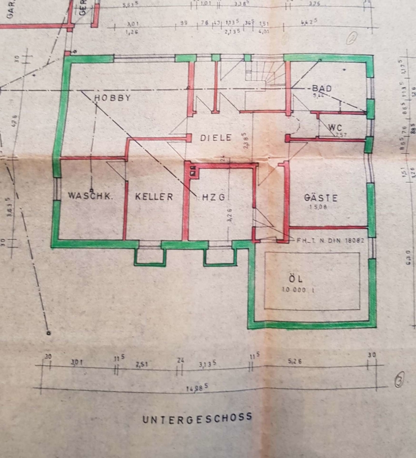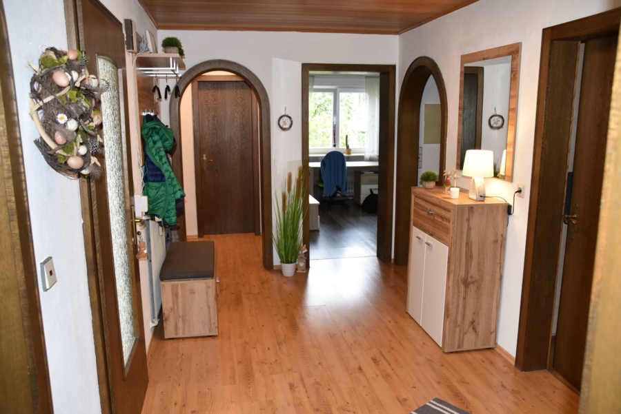 Die vorderen Zimmer und das Schlafzimmer haben durch die leichte Hanglage Tagesslicht. Das WC und das Badezimmer sind hier ebenfalls getrennt. Der Flur ist sehr breit, von hier aus erreicht man bequem alle Kellerräume des Hauses.