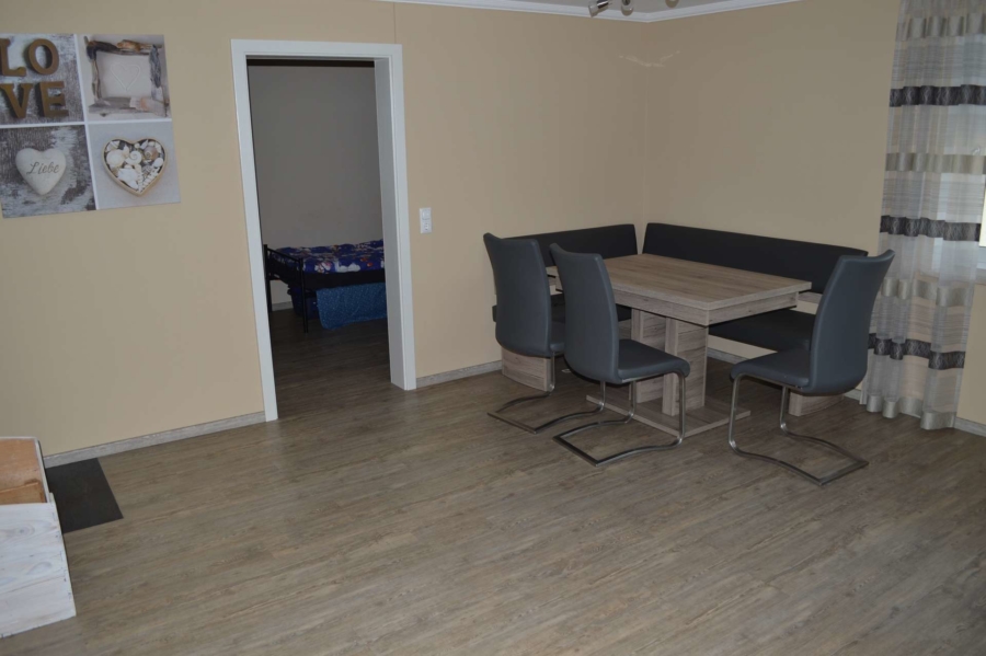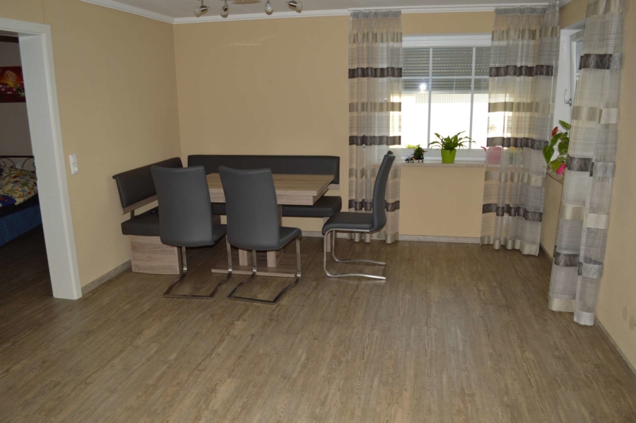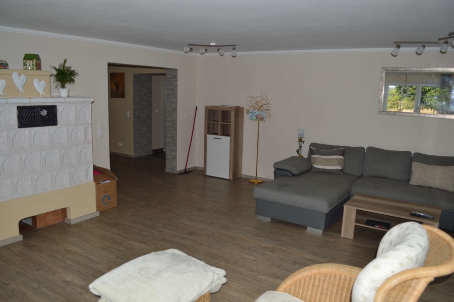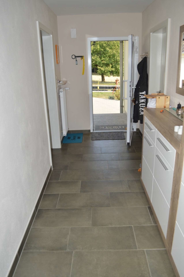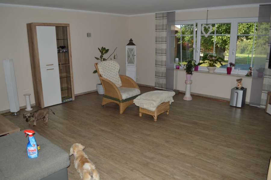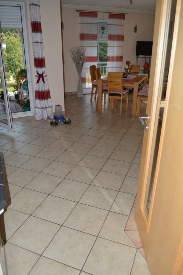 Vinylboden im Wohn-, Ess- und Schlafzimmer des Erdgeschosses. Zwei Kachelöfen