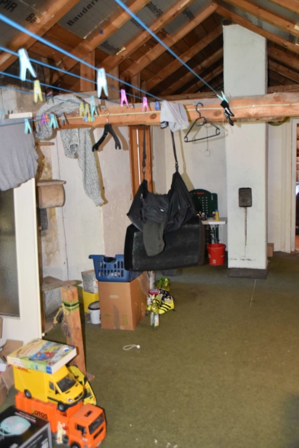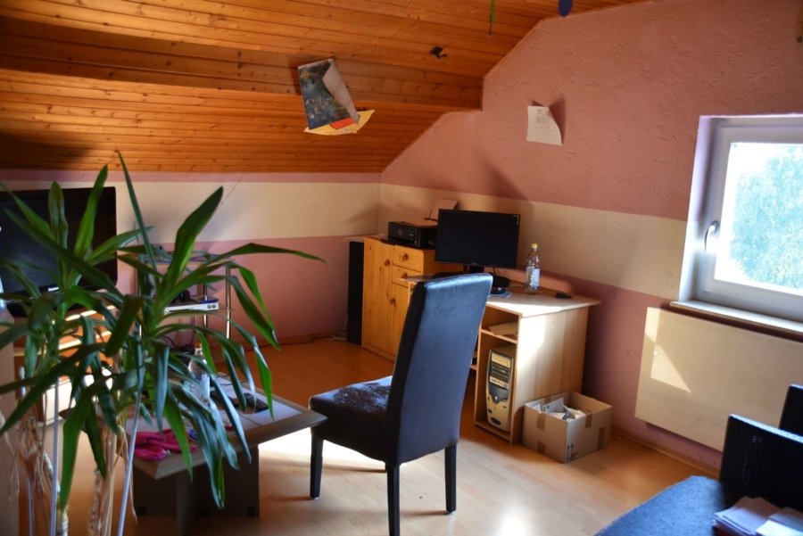 Über einen breiten Flur erreicht man die Zimmer der gut geschnittenen Wohneinheiten. Die OG Wohnung bietet einen Balkon, die EG Wohung eine Terrasse. Sämtliche Zwischendecken des Gebäudes sind betoniert. Im Dachgeschoss steht noch eine Ausbaureserve als zusätzliche Wohnung zur Verfügung. Ein einfaches Badezimmer wurde bereits instsalliert und ein kleiner Hobbyraum ist dort ebenfalls schon vorhanden. Hier könnte mit relativ wenig Aufwand eine dritte Wohnung mit Mansarde entstehen.