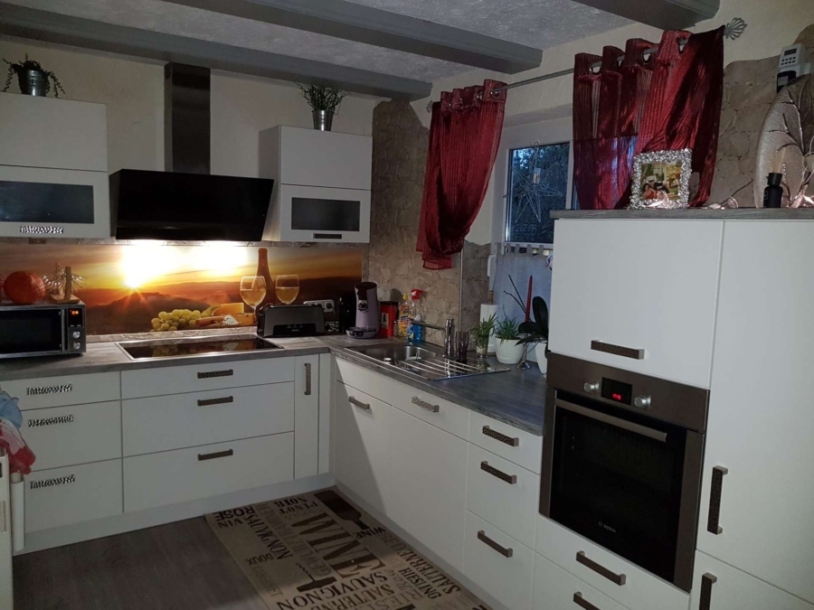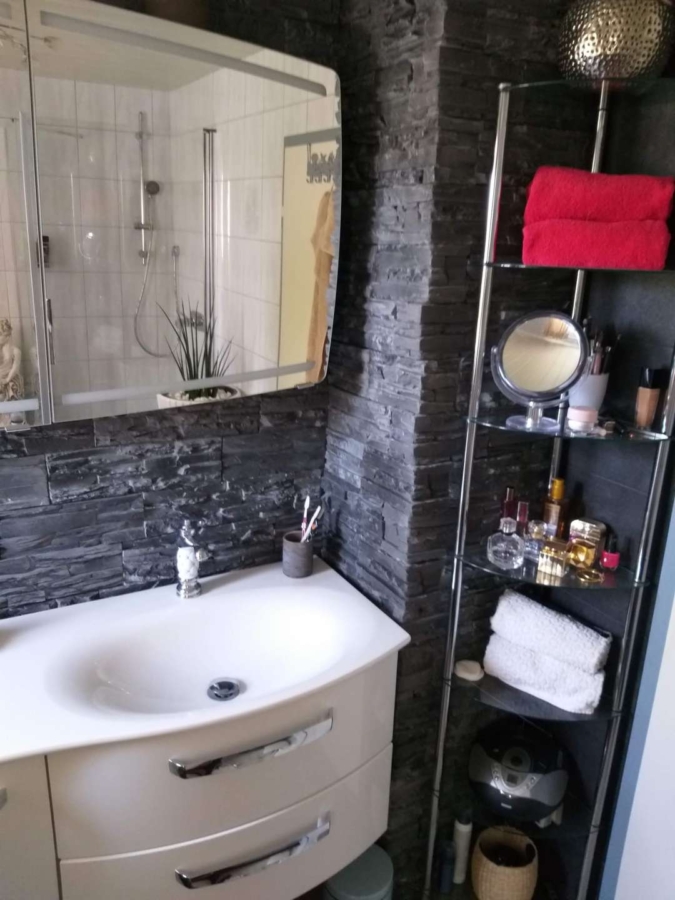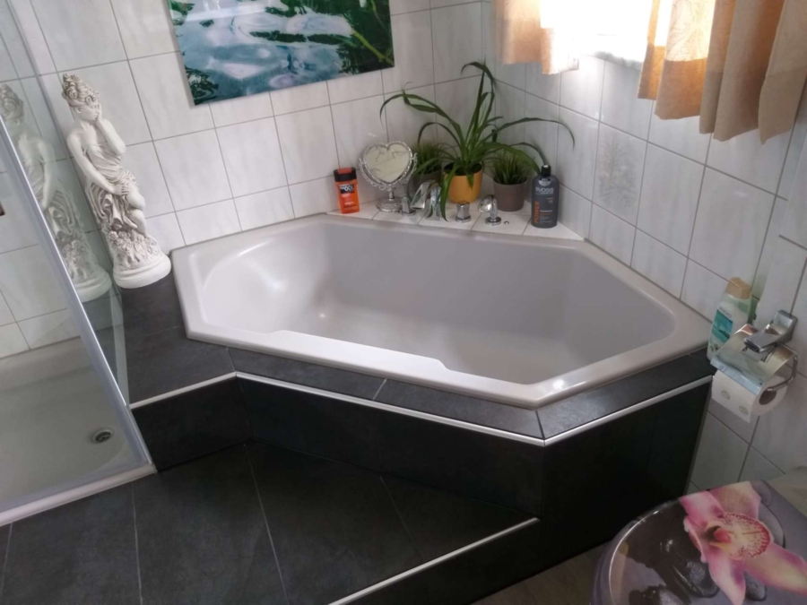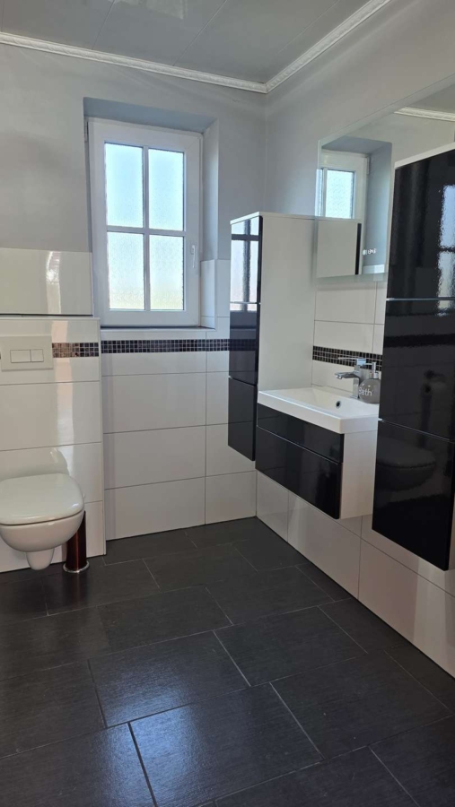 Die Haupteinheit im Erdgeschoss präsentiert sich als die großzügigste und ist besonders einladend. Zur Straßenseite hin liegen ein praktischer Vorratsraum und ein separates Gäste-WC. Das moderne, stylische Bad in eleganter Anthrazit-Grau-Weiß-Kombination verfügt über ein WC, eine Eckbadewanne und eine separate Dusche. Die geräumige Küche ist mit einer modernen Einbauküche ausgestattet, die zum Kochen und Wohlfühlen einlädt