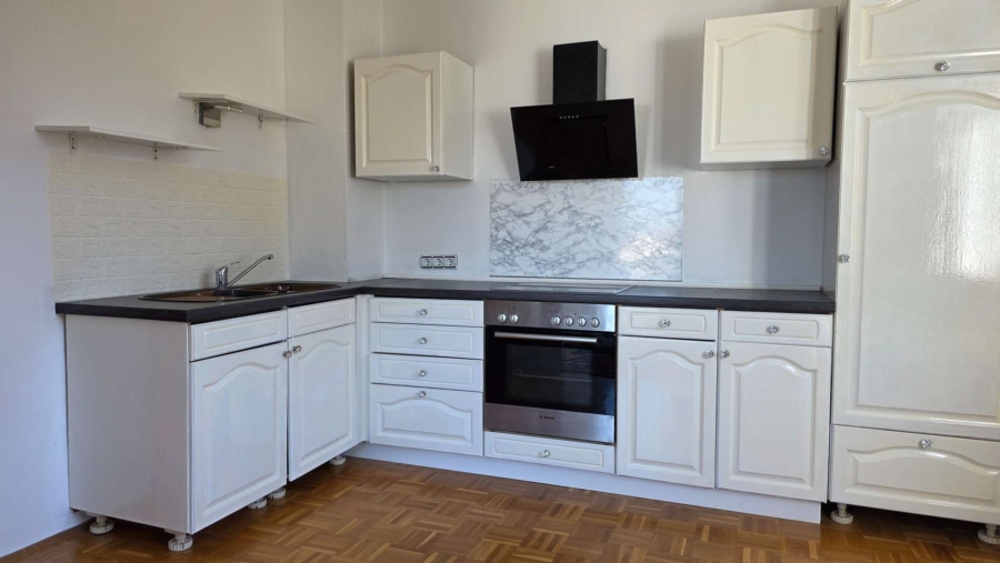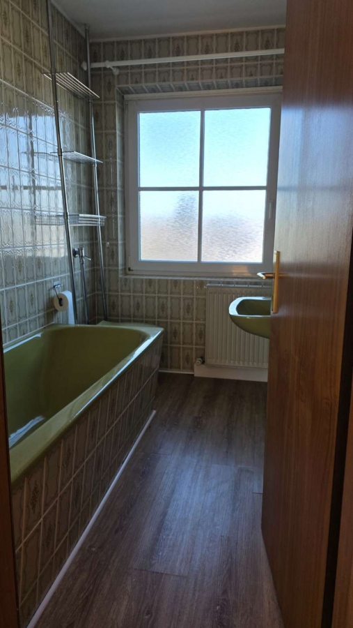 Wieder zurück im Treppenhaus befindet sich direkt gegenüber rechts die kompakte, aber charmante dritte Einheit – ideal für Singles oder als Einliegerwohnung. Hier finden Sie eine Küche mit Einbauküche und Essbereich inklusive eines kleinen Balkons. Das Bad entspricht dem Baujahr und bietet Wanne sowie WC. Das angrenzende Wohn-Schlafzimmer öffnet sich zum großen Balkon Richtung Garten – der Zugang ist derzeit verdeckt, lässt sich jedoch mit geringem Aufwand wieder freilegen.