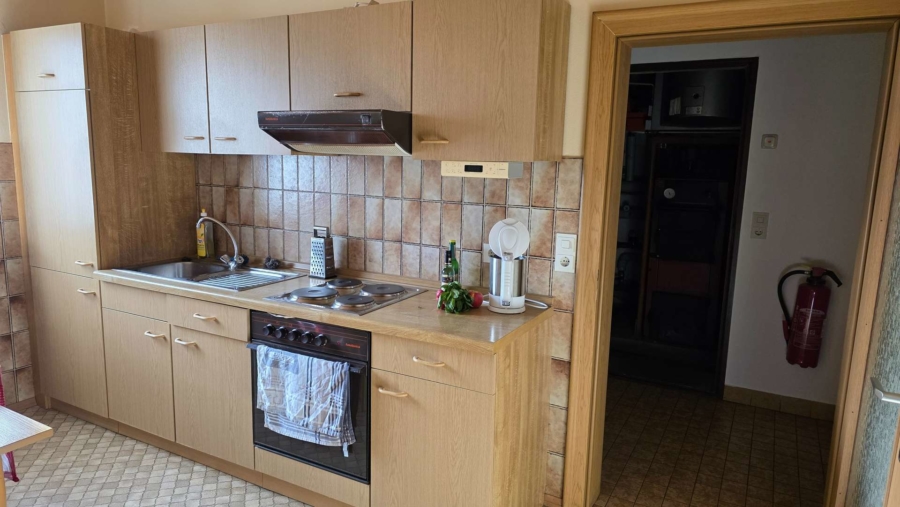 Linker Hand gelangen Sie in das Herzstück des Anwesens, die große Wohnküche mit gemütlichem Essplatz, rustikaler Einbauküche und angrenzendem praktischen Vorratsraum mit viel Platz für Vorräte.