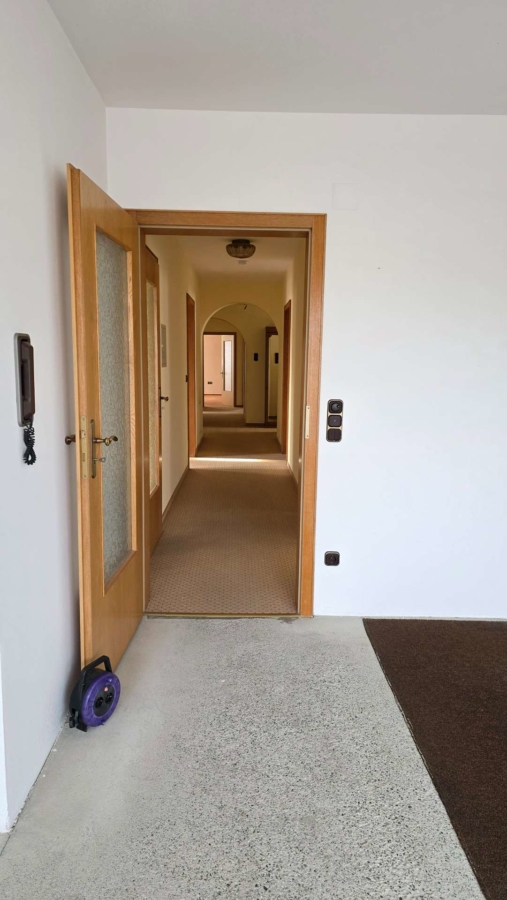 Ein langer, lichtdurchfluteter Flur verbindet alle Zimmer auf beiden Seiten und schafft ein einladendes Ambiente. Direkt auf der rechten Seite betritt man das große Wohnzimmer mit bodentiefer Glasfront und direktem Zugang zur beeindruckenden Dachterrasse. Hier können Sie die Sonne genießen und haben einen fantastischen Blick über den Ort und zur Kirche.
