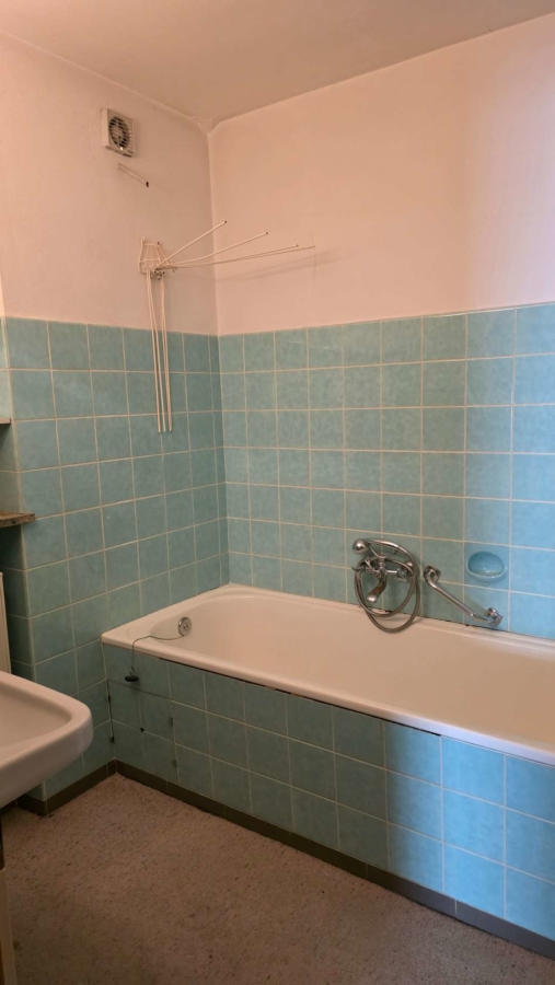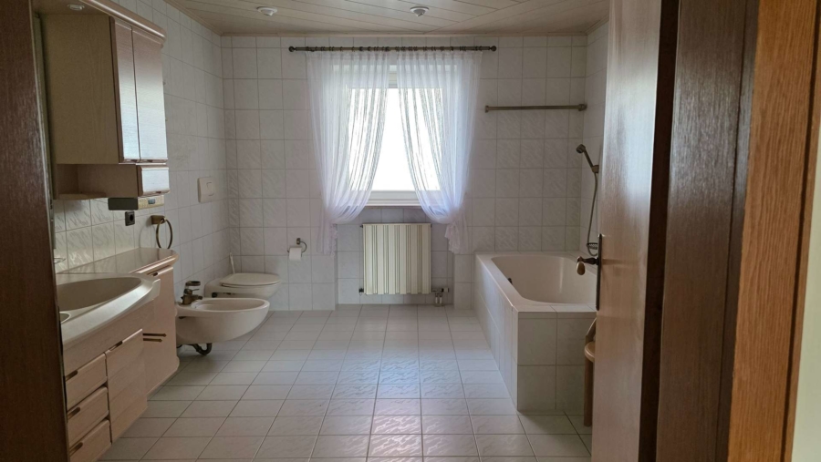 Rechts betreten Sie das zeitlos gestaltete Badezimmer mit Wanne, Dusche und Bidet. Dann befindet sich in etwa in der Mitte des Gebäudes ein zweiter Hausflur, der ebenfalls alle drei Etagen miteinander verbindet. Gegenüber ist ein zweckmäßiges zweites Badezimmer mit Wanne und einem separaten Gäste-WC.