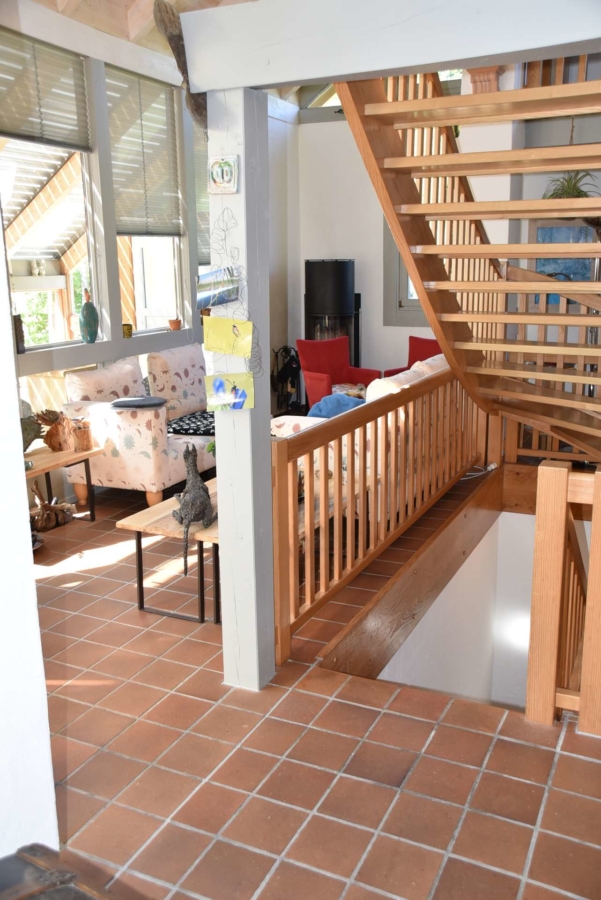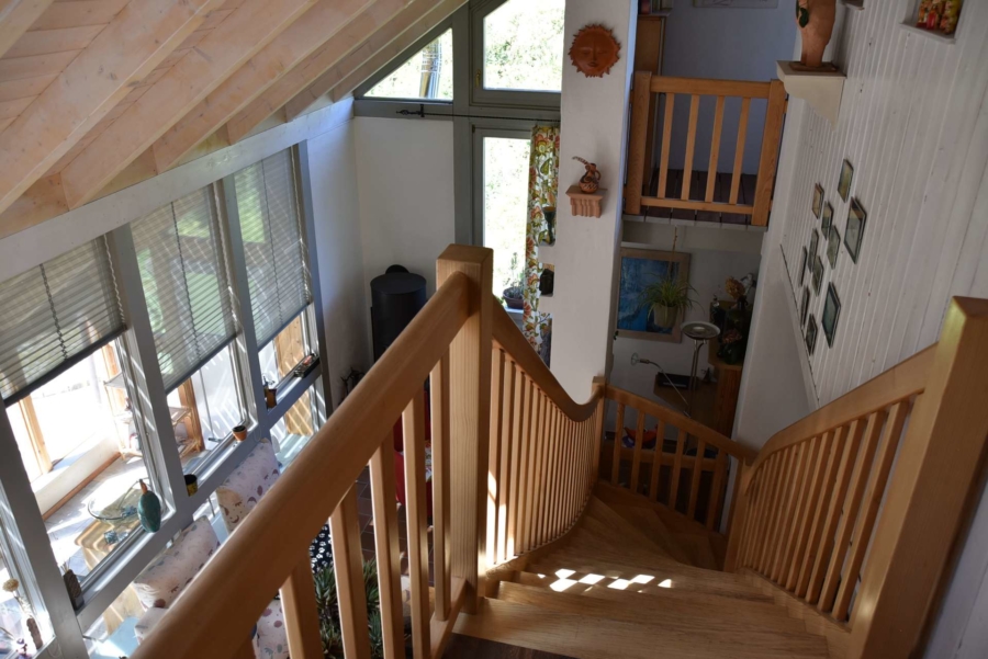 Eine freitragende Holztreppe führt Sie innerhalb des Wintergartens in das Obergeschoss.